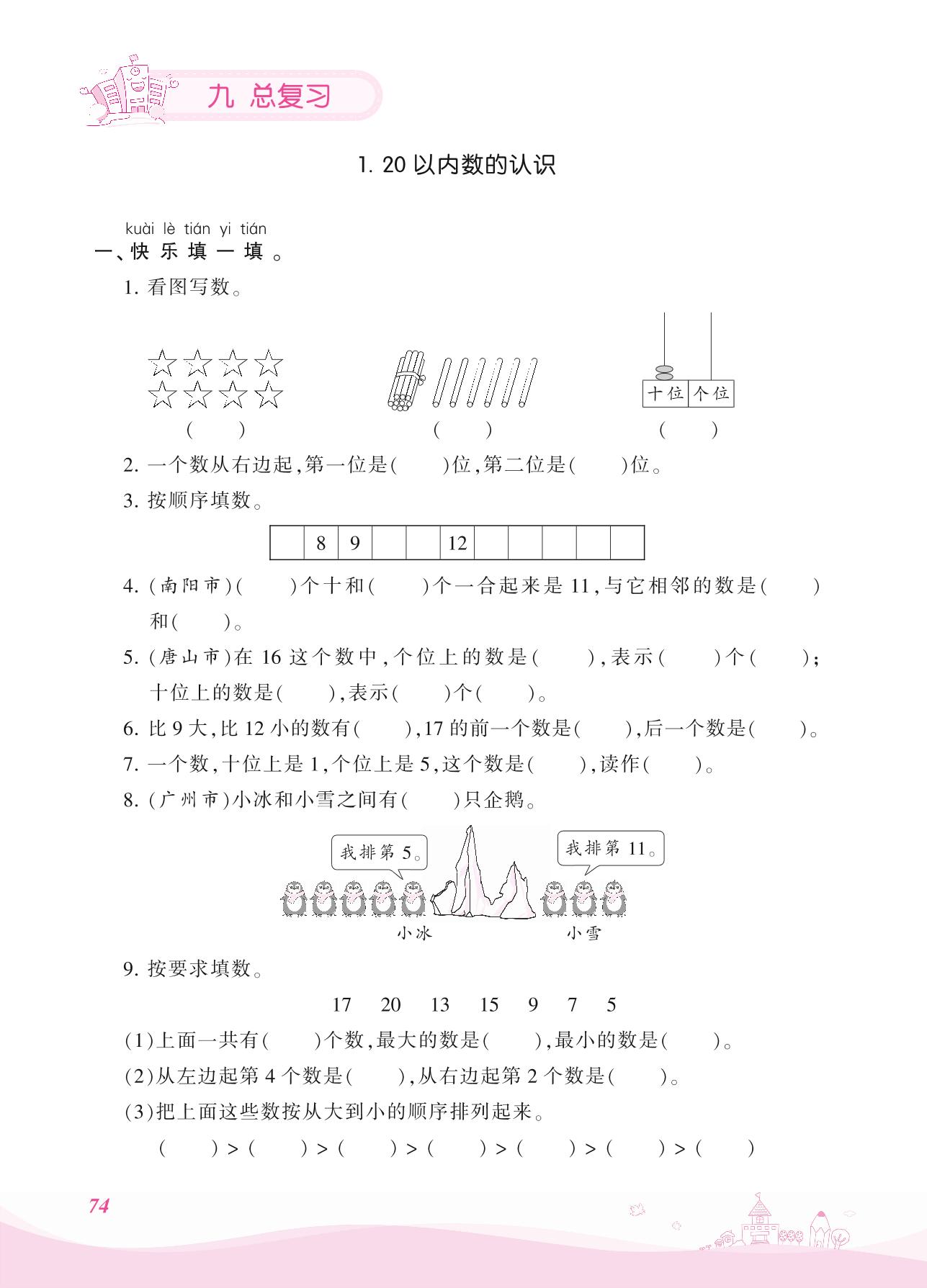 2021上册一年级数学人教版 九 总复习——1. 20以内数的认识