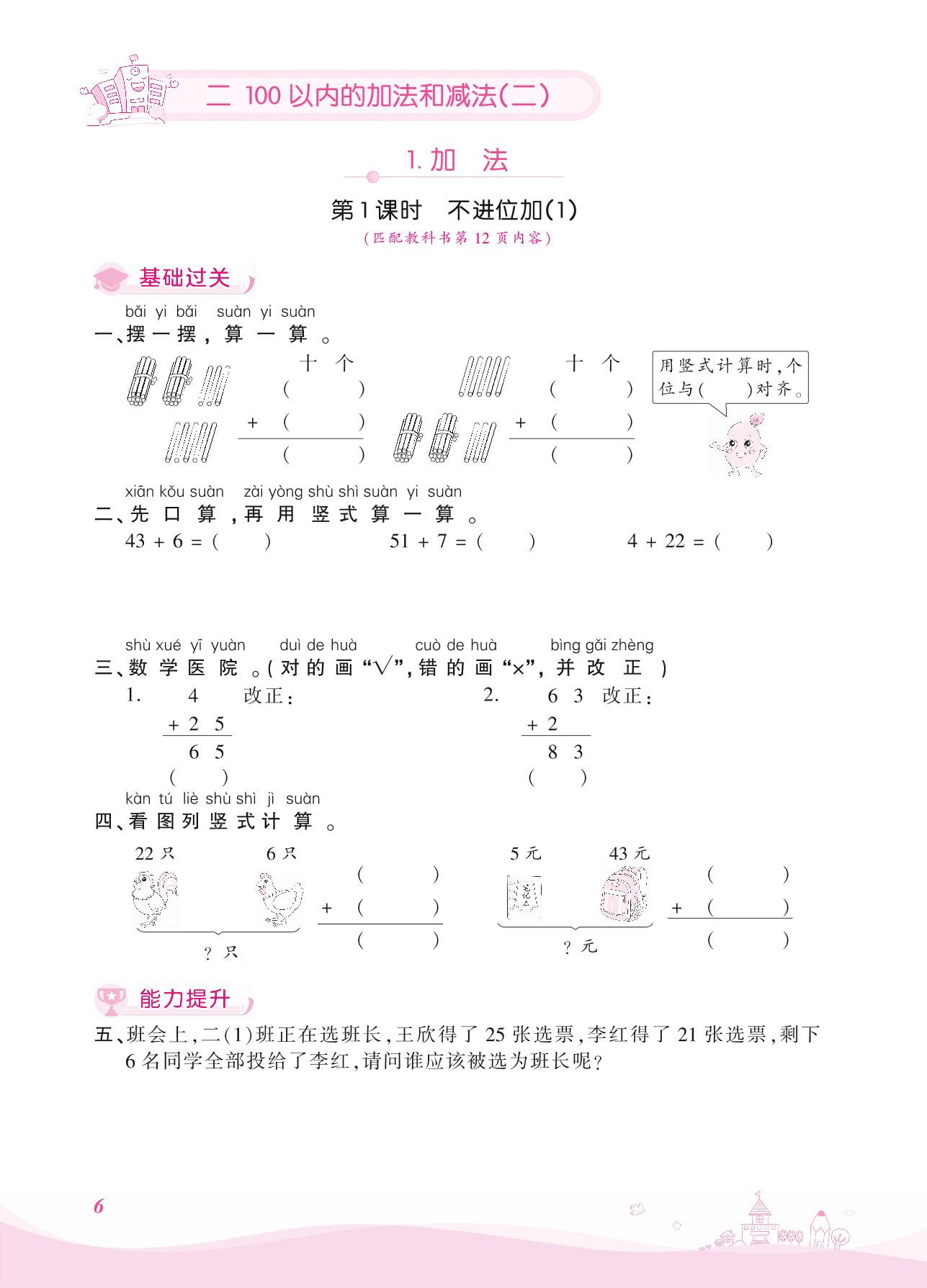 2021上册二年级数学人教版 二 100以内的加法和减法(二) 1. 加法——第1课时 不进位加(1)