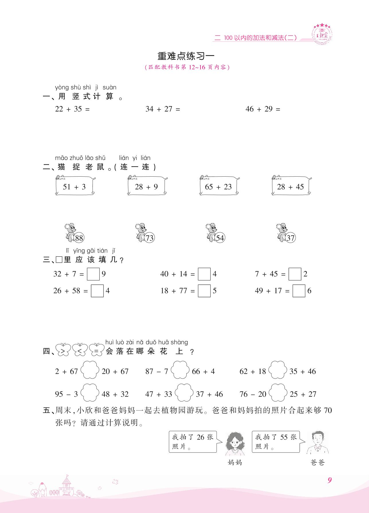 2021上册二年级数学人教版 二 100以内的加法和减法(二) 1. 加法——重难点练习一