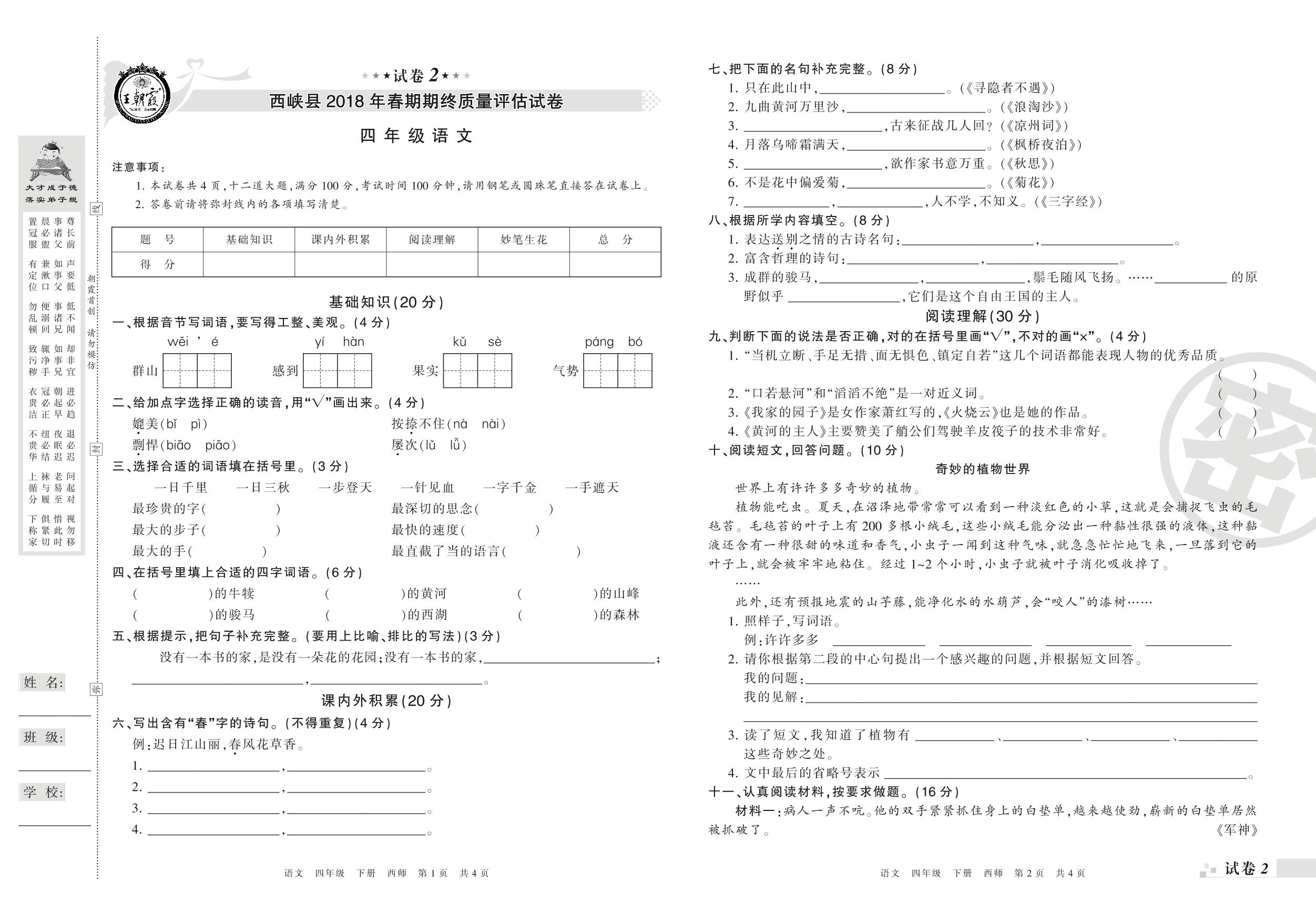 2017-2018学年第二学期南阳市西峡县四年级语文试卷(西师版)【2】