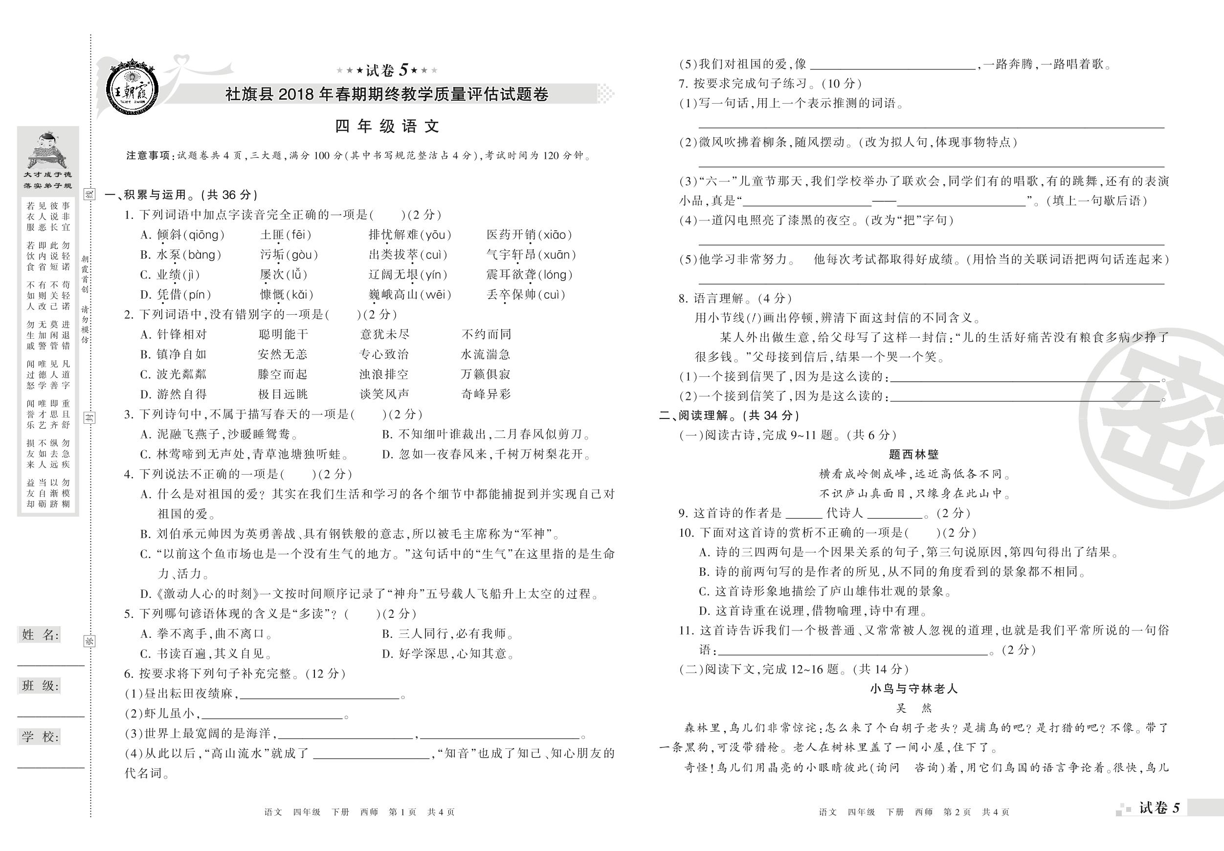 2017-2018学年第二学期南阳市社旗县四年级语文试卷(西师版)【5】