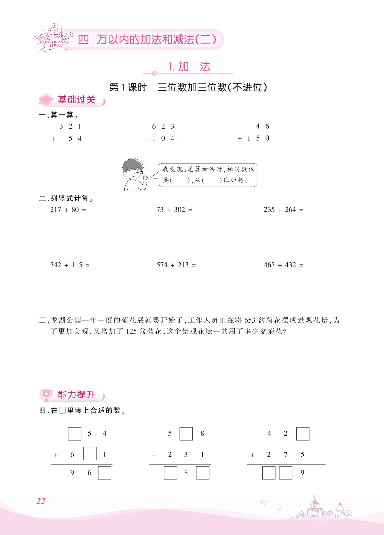 2021上册三年级数学人教版 四 万以内的加法和减法(二) 1. 加法——第1课时 三位数加三位数(不进位)