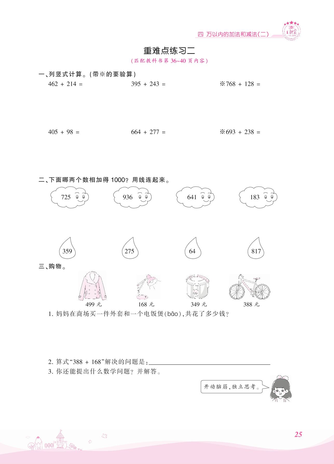 2021上册三年级数学人教版 四 万以内的加法和减法(二) 1. 加法——重难点练习二