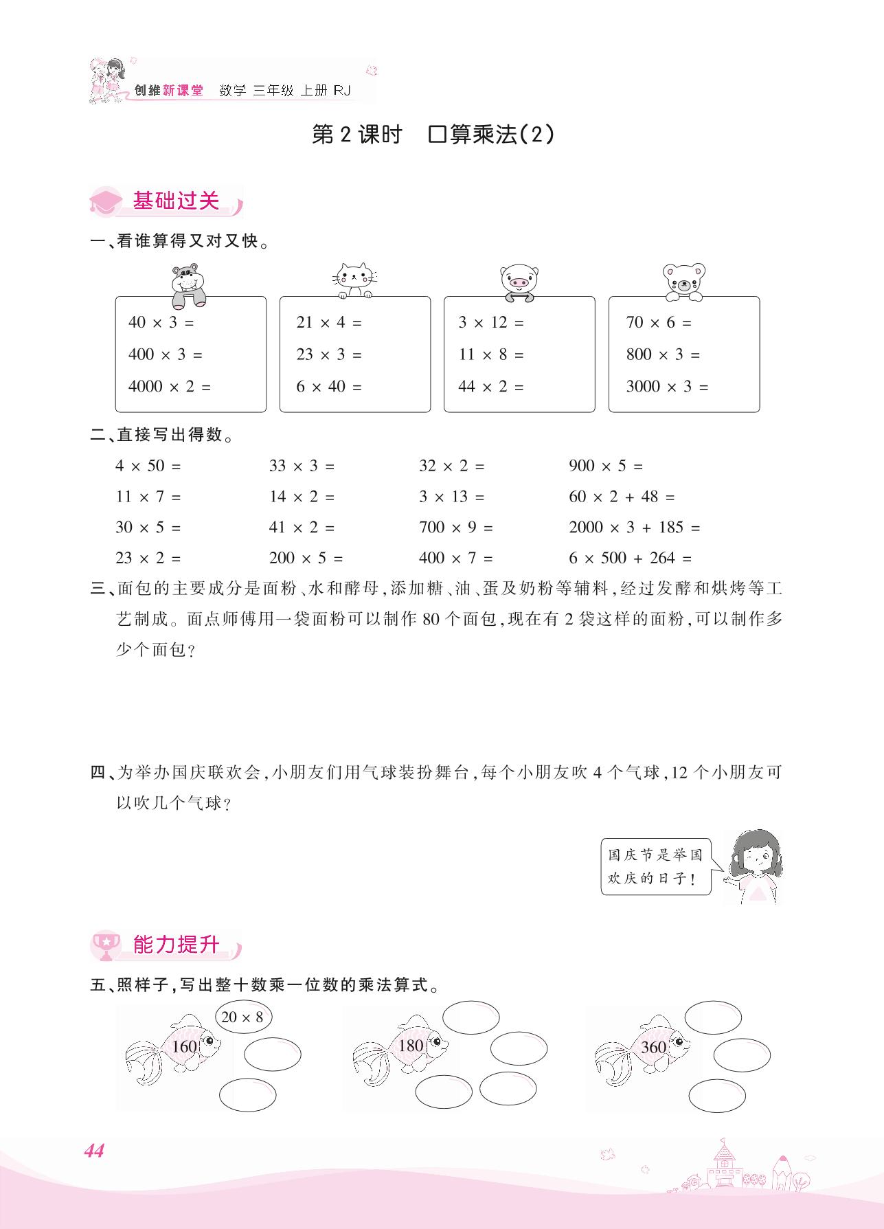 2021上册三年级数学人教版 六 多位数乘一位数 1. 口算乘法——第2课时 口算乘法(2)