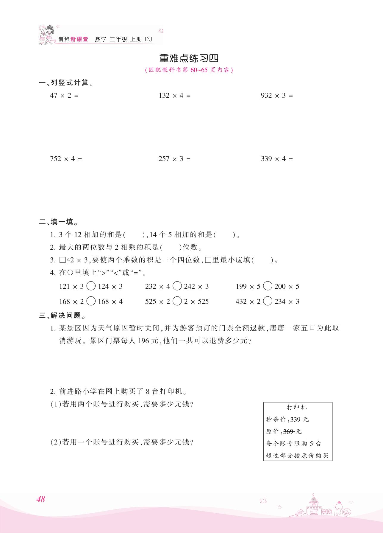 2021上册三年级数学人教版 六 多位数乘一位数 2. 笔算乘法——重难点练习四