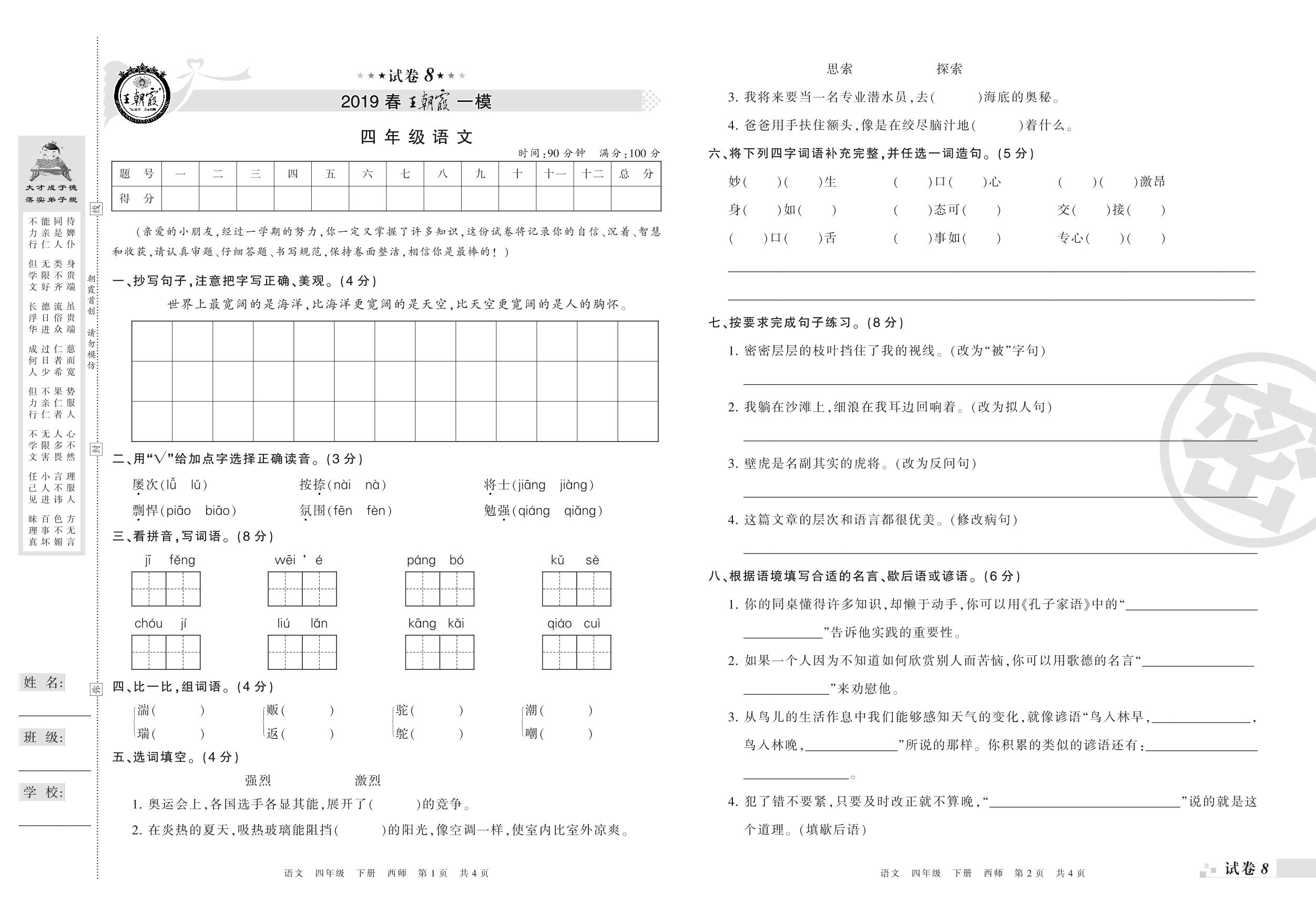 王朝霞期末模拟卷四年级下册语文(西师版)_R210801201403【8】
