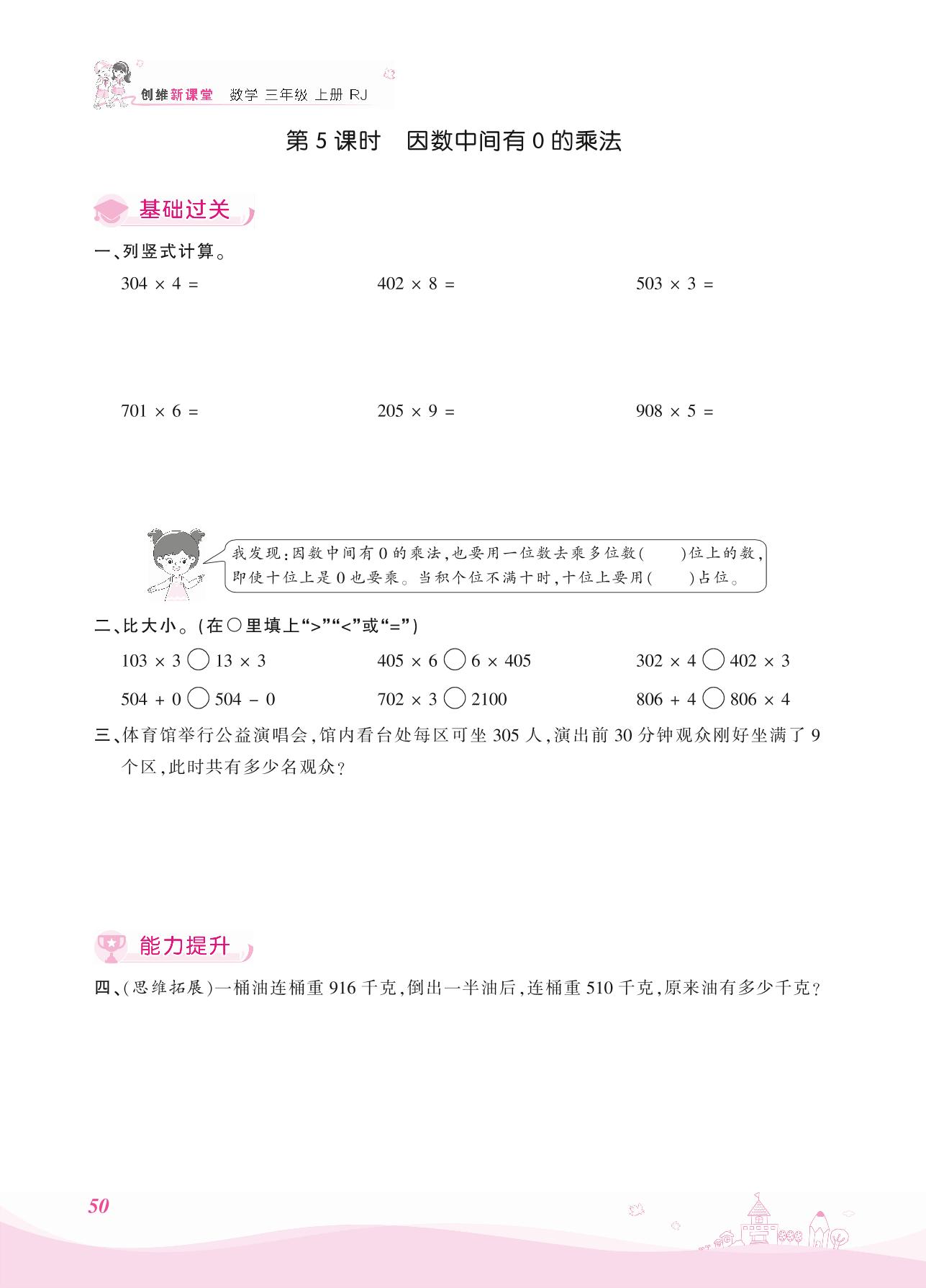 2021上册三年级数学人教版 六 多位数乘一位数 2. 笔算乘法——第5课时 因数中间有0的乘法