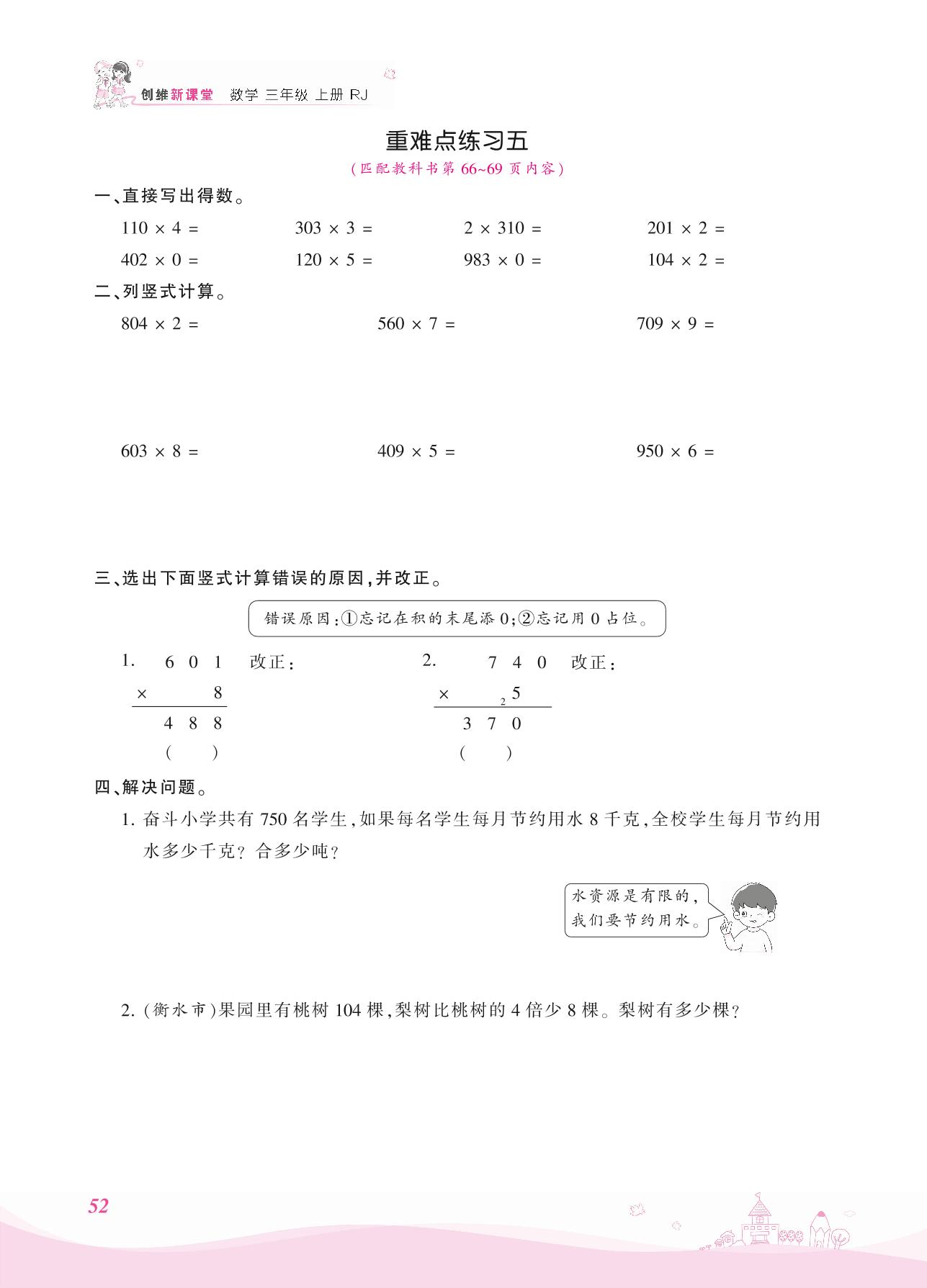 2021上册三年级数学人教版 六 多位数乘一位数 2. 笔算乘法——重难点练习五