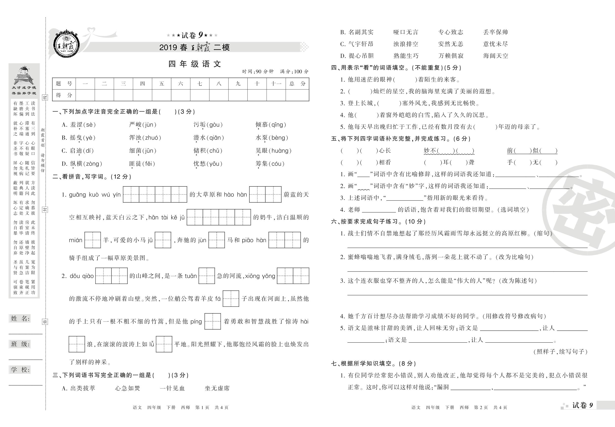 王朝霞期末模拟卷四年级下册语文(西师版)_R210801201407【9】