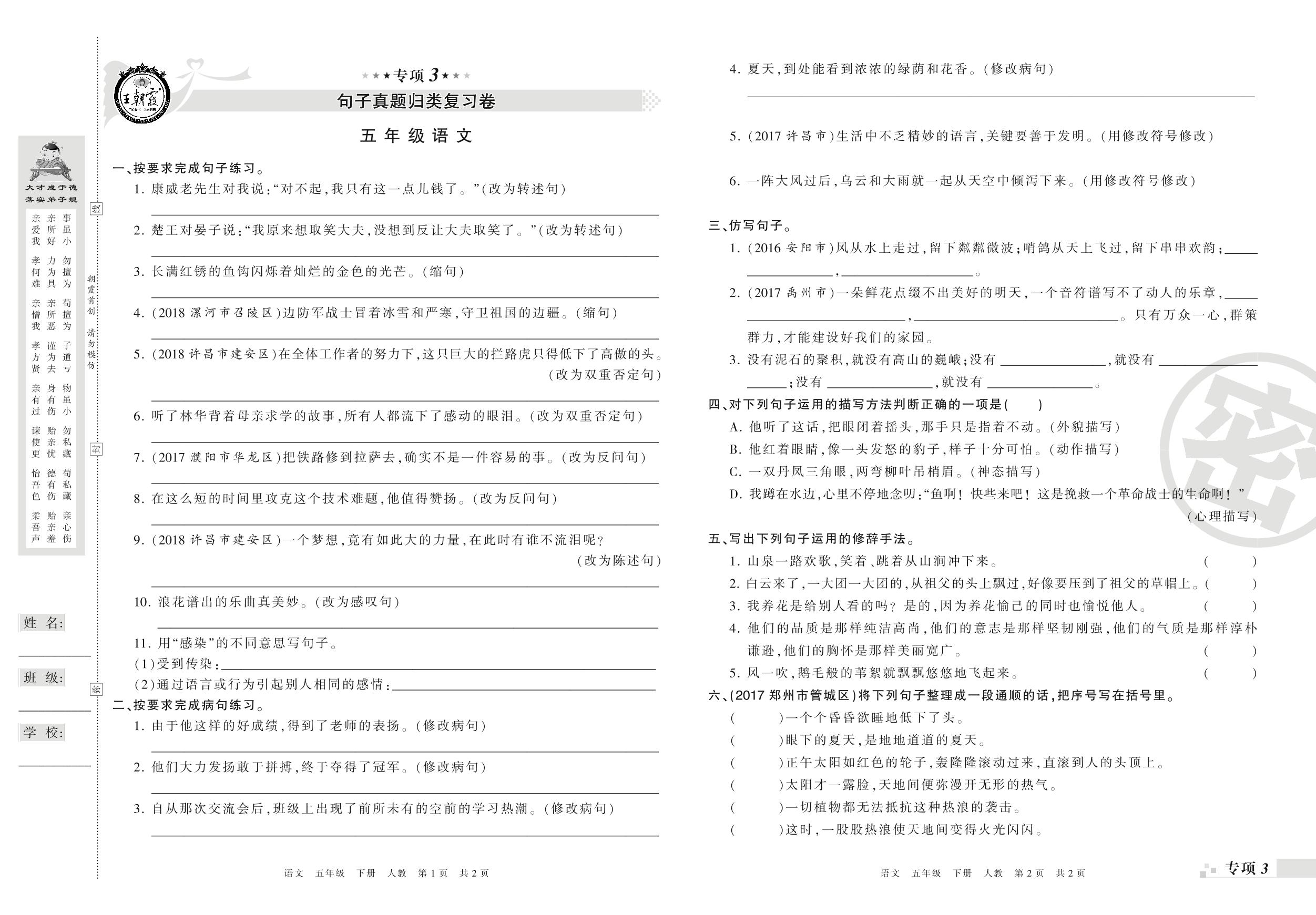 王朝霞期末专项卷——句子、课文内容真题归类复习五年级下册语文(人教版)_R210801201414【0】