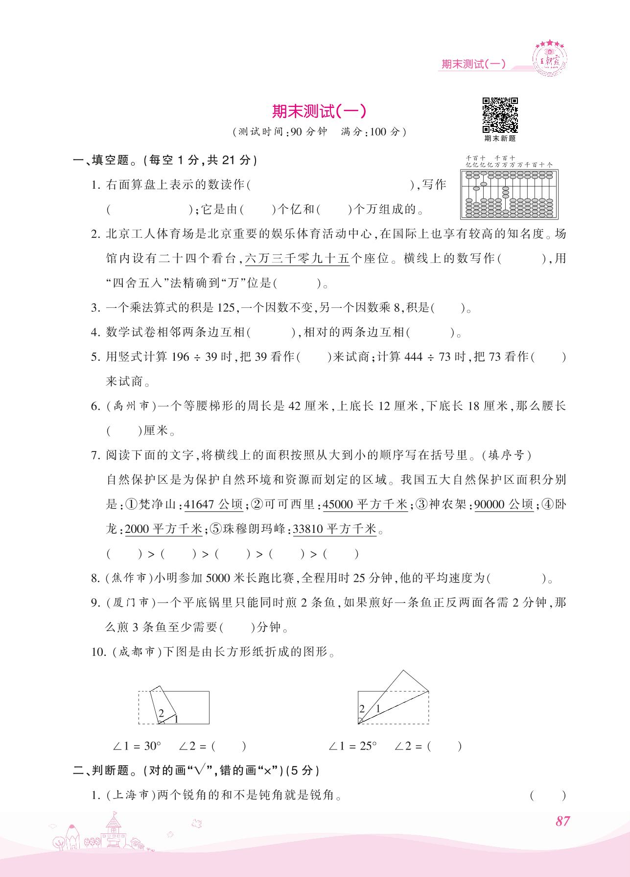 2021上册四年级数学人教版 期末测试(一)