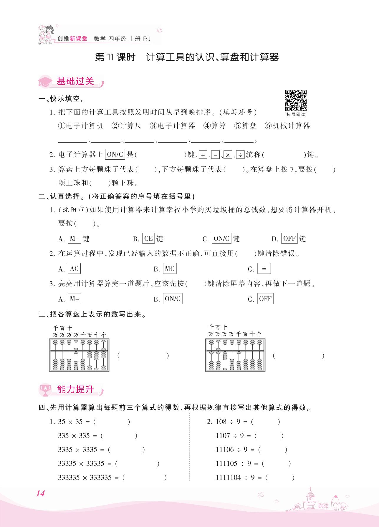 2021上册四年级数学人教版 一 大数的认识 ——第11课时 计算工具的认识、算盘和计算器