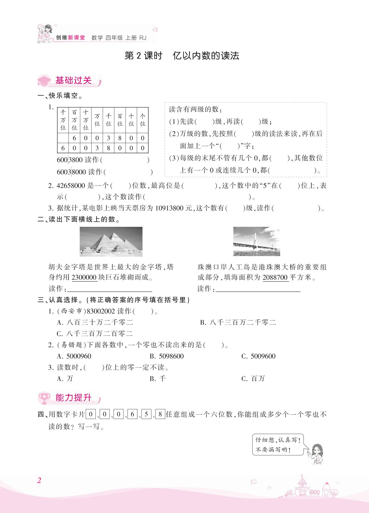 2021上册四年级数学人教版 一 大数的认识 ——第2课时 亿以内数的读法