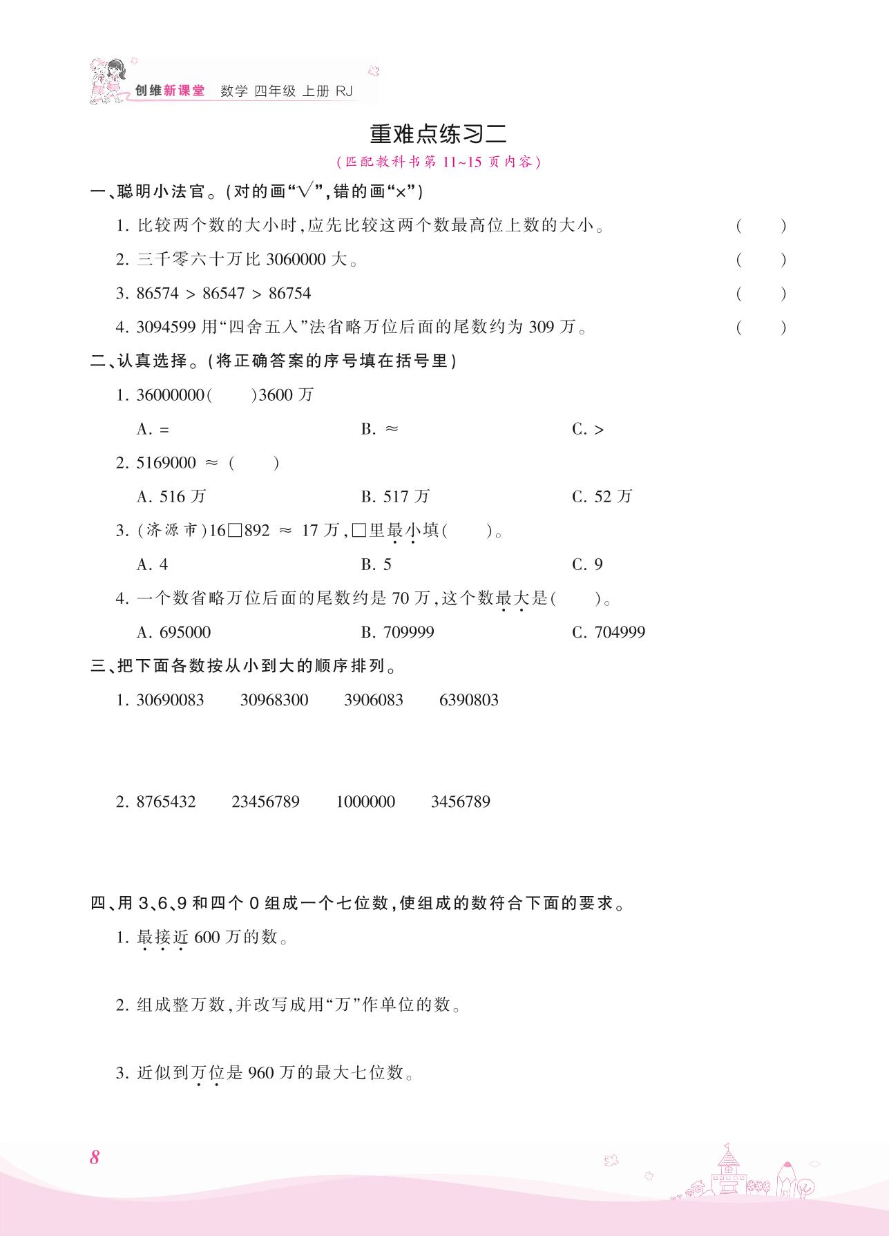 2021上册四年级数学人教版 一 大数的认识 ——重难点练习二