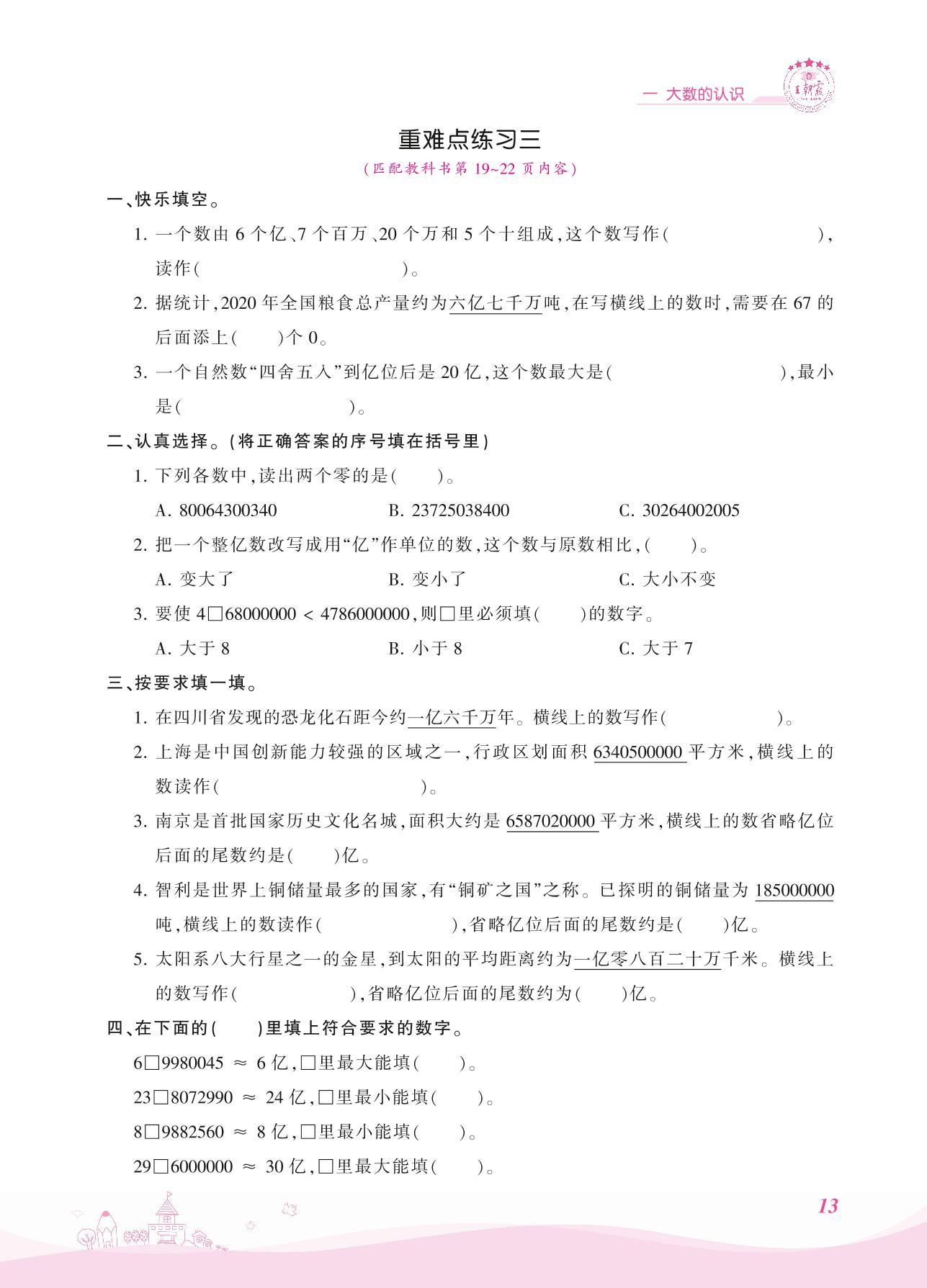 2021上册四年级数学人教版 一 大数的认识 ——重难点练习三