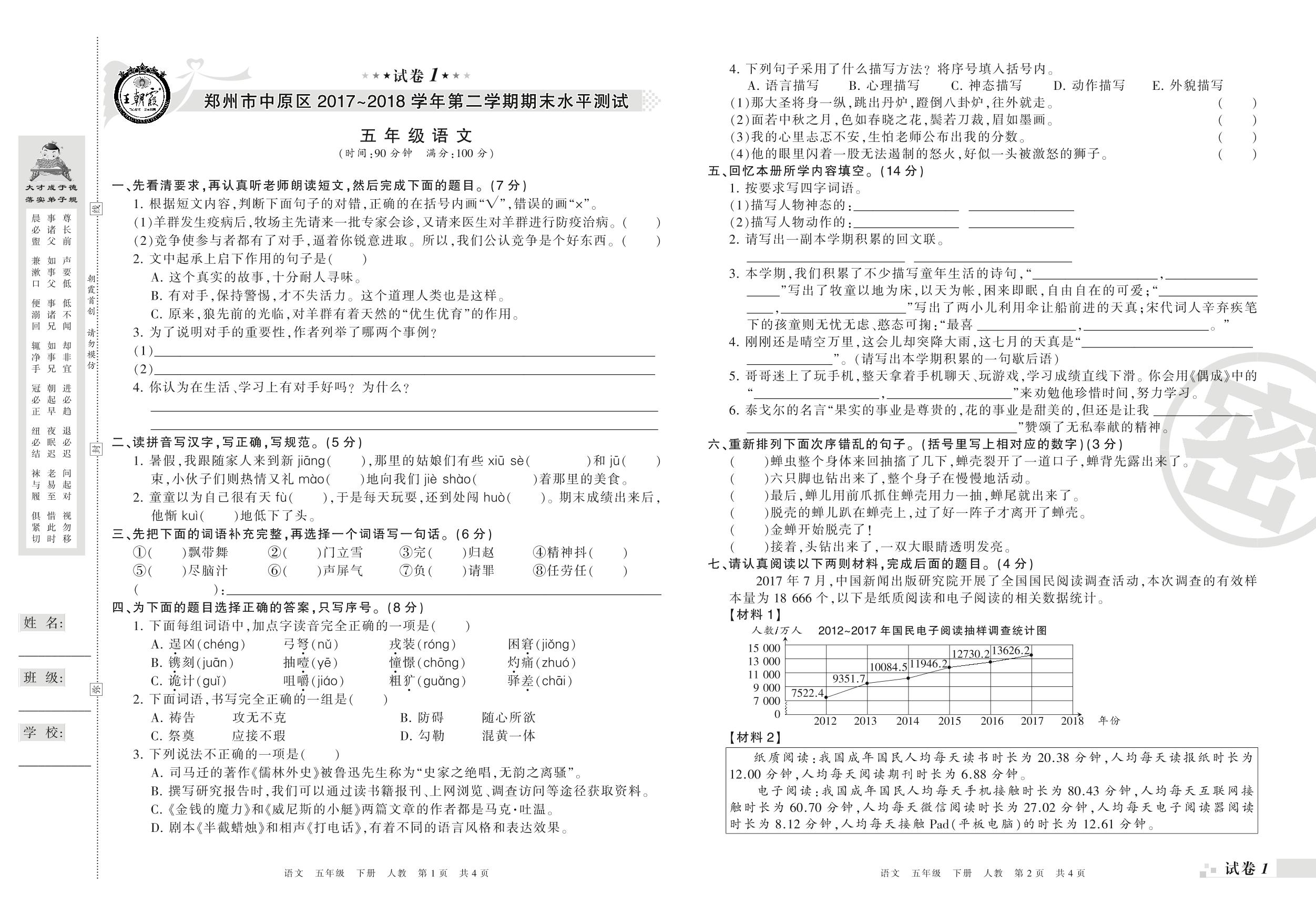 2017-2018学年第二学期郑州市中原区五年级语文试卷(人教版)_R210801201427【1】