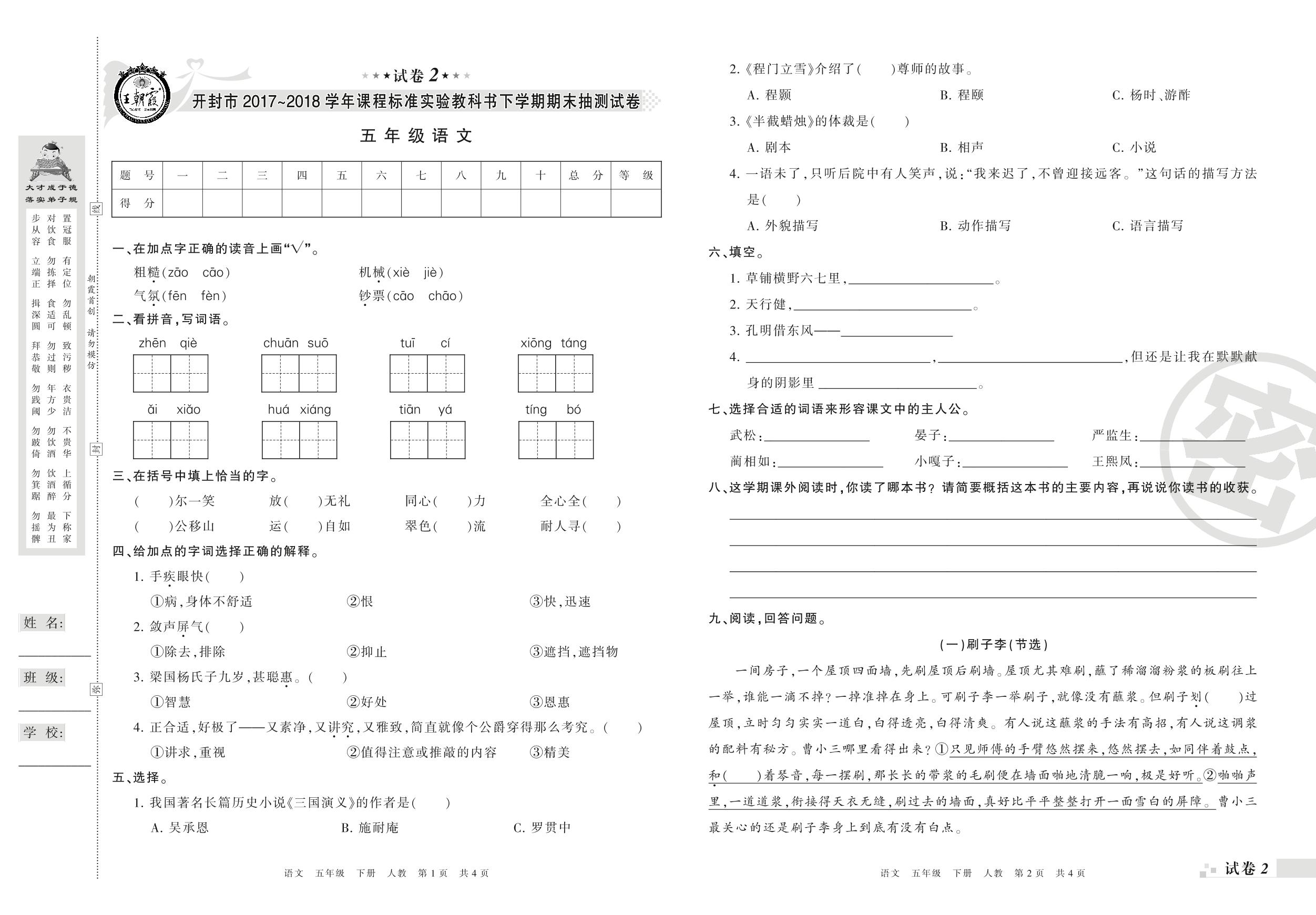 2017-2018学年第二学期开封市五年级语文试卷(人教版)_R210801201433【2】