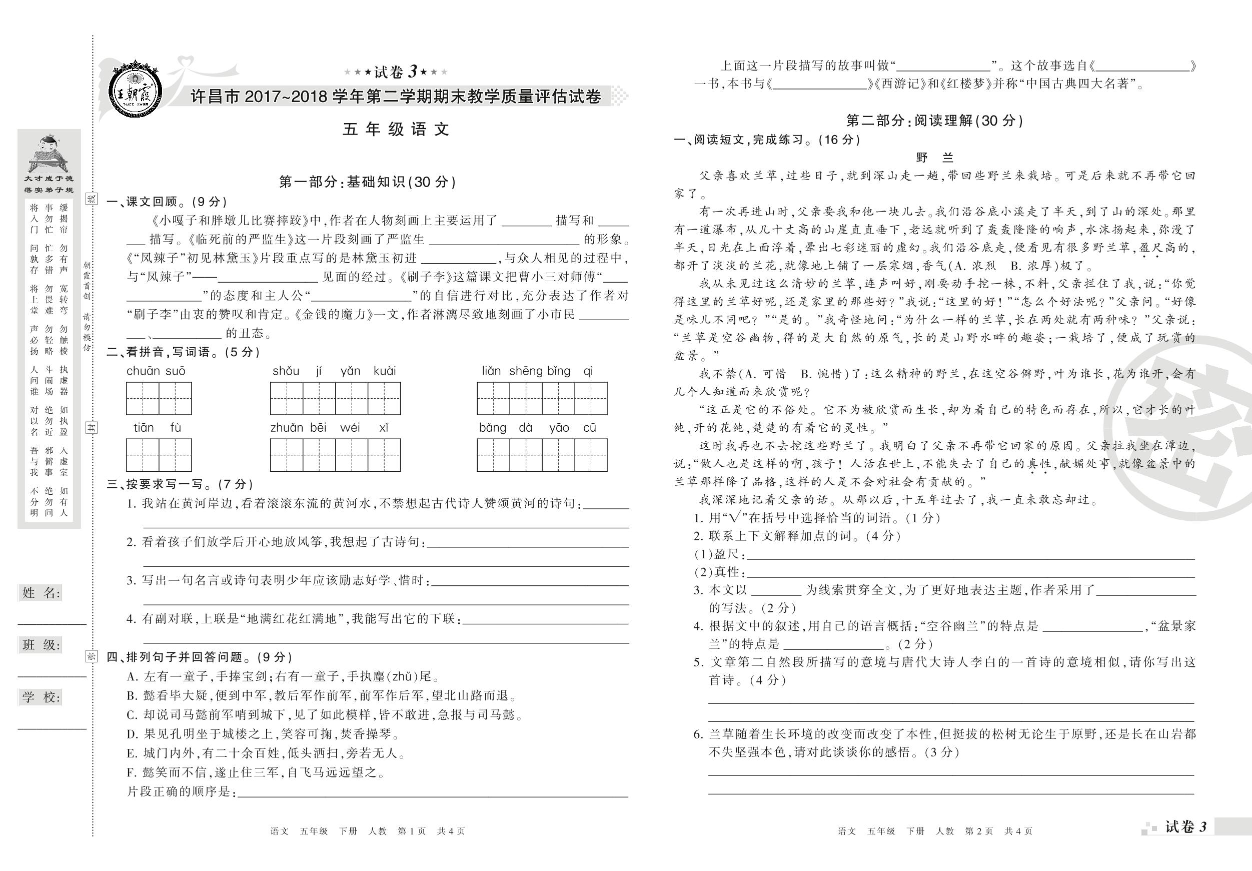 2017-2018学年第二学期许昌市五年级语文试卷(人教版)【3】