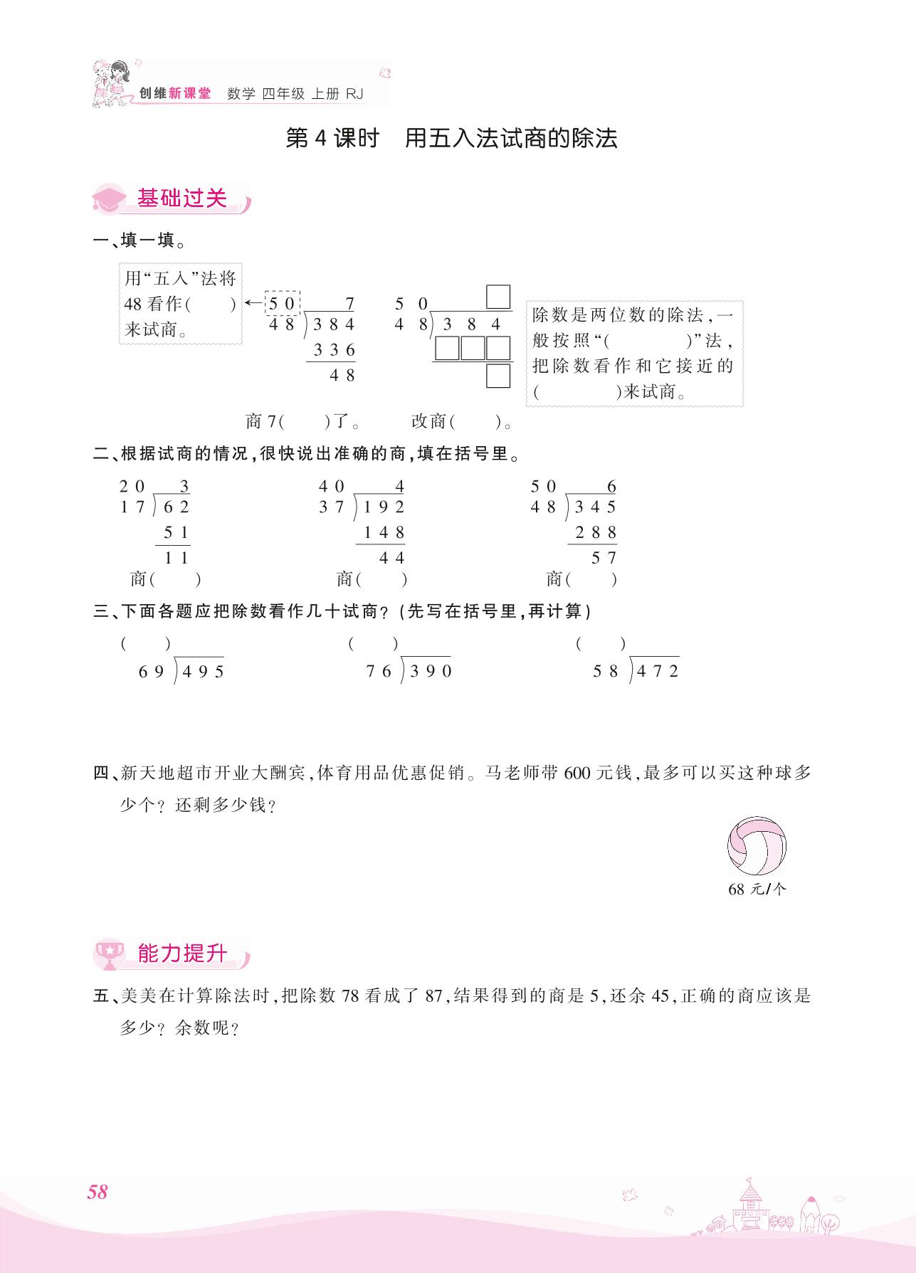 2021上册四年级数学人教版 六 除数是两位数的除法 2. 笔算除法——第4课时 用五入法试商的除法