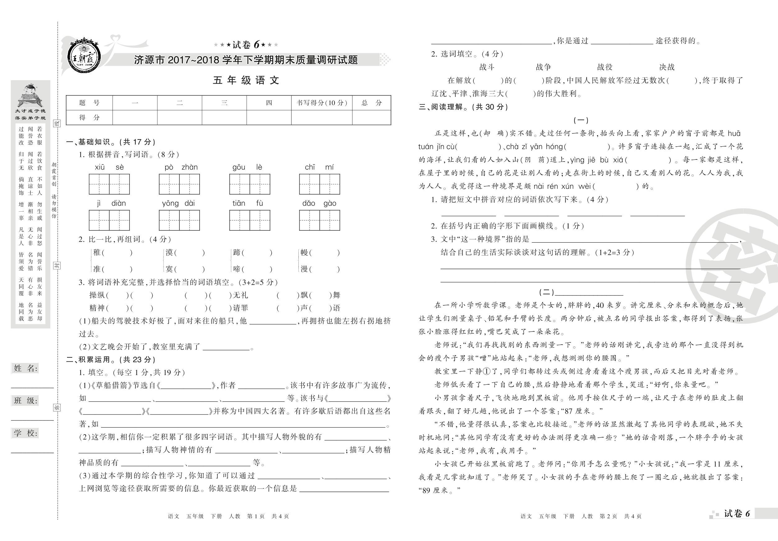 2017-2018学年第二学期济源市五年级语文试卷(人教版)【6】