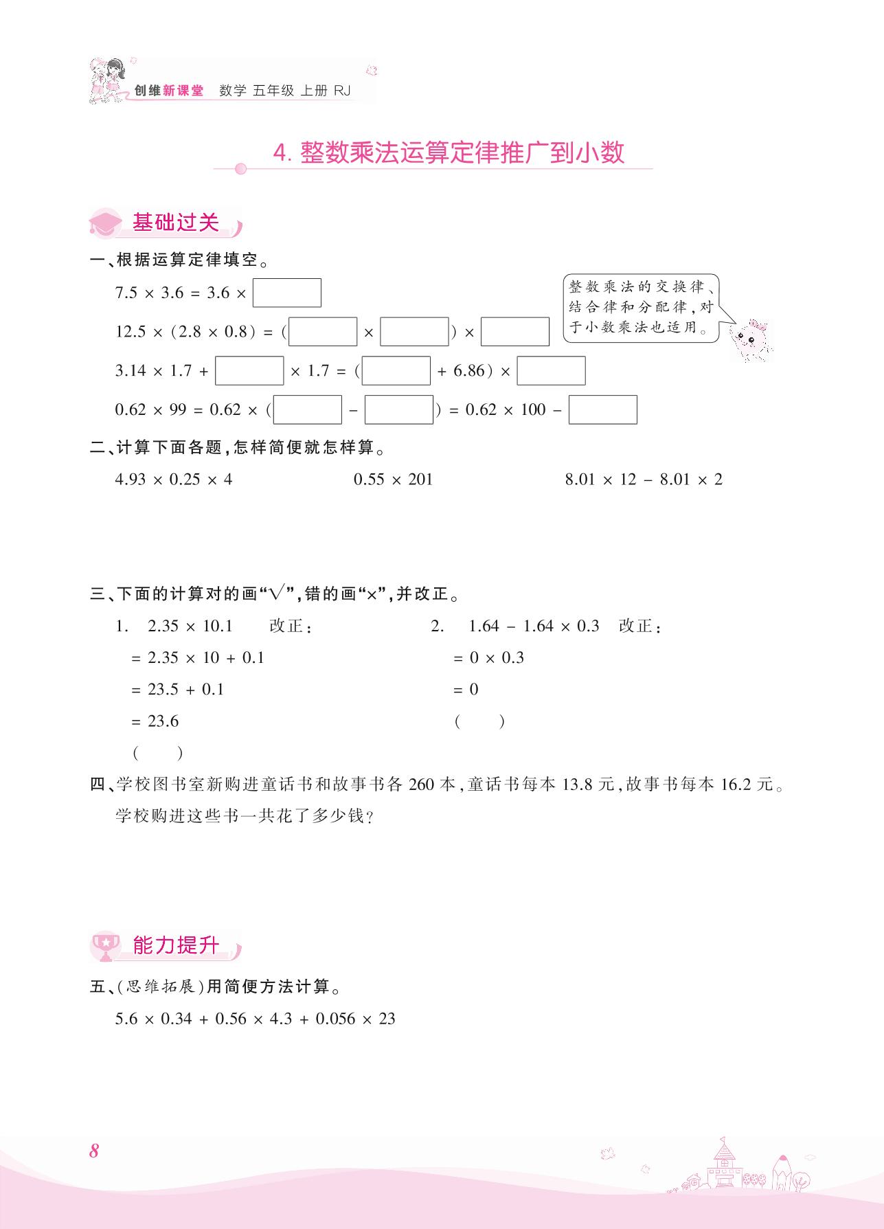2021上册五年级数学人教版 一 小数乘法 4. 整数乘法运算定律推广到小数