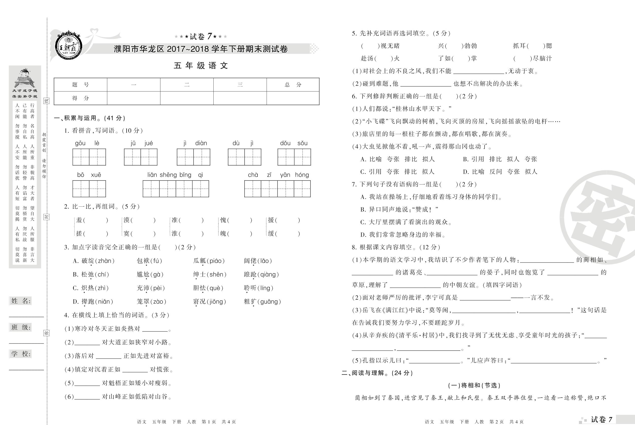 2017-2018学年第二学期濮阳市华龙区五年级语文试卷(人教版)【7】