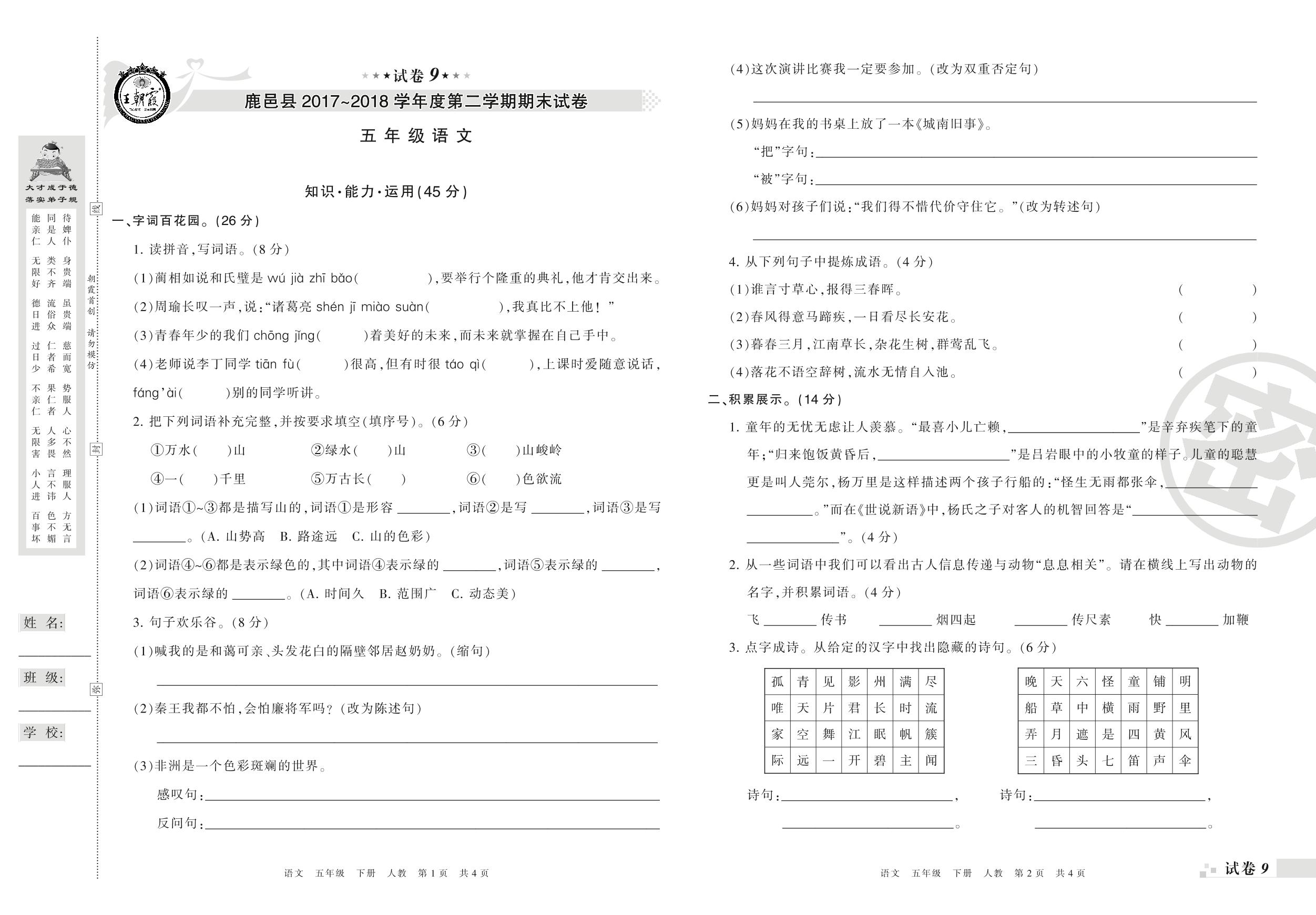 2017-2018学年第二学期周口市鹿邑县五年级语文试卷(人教版)【9】