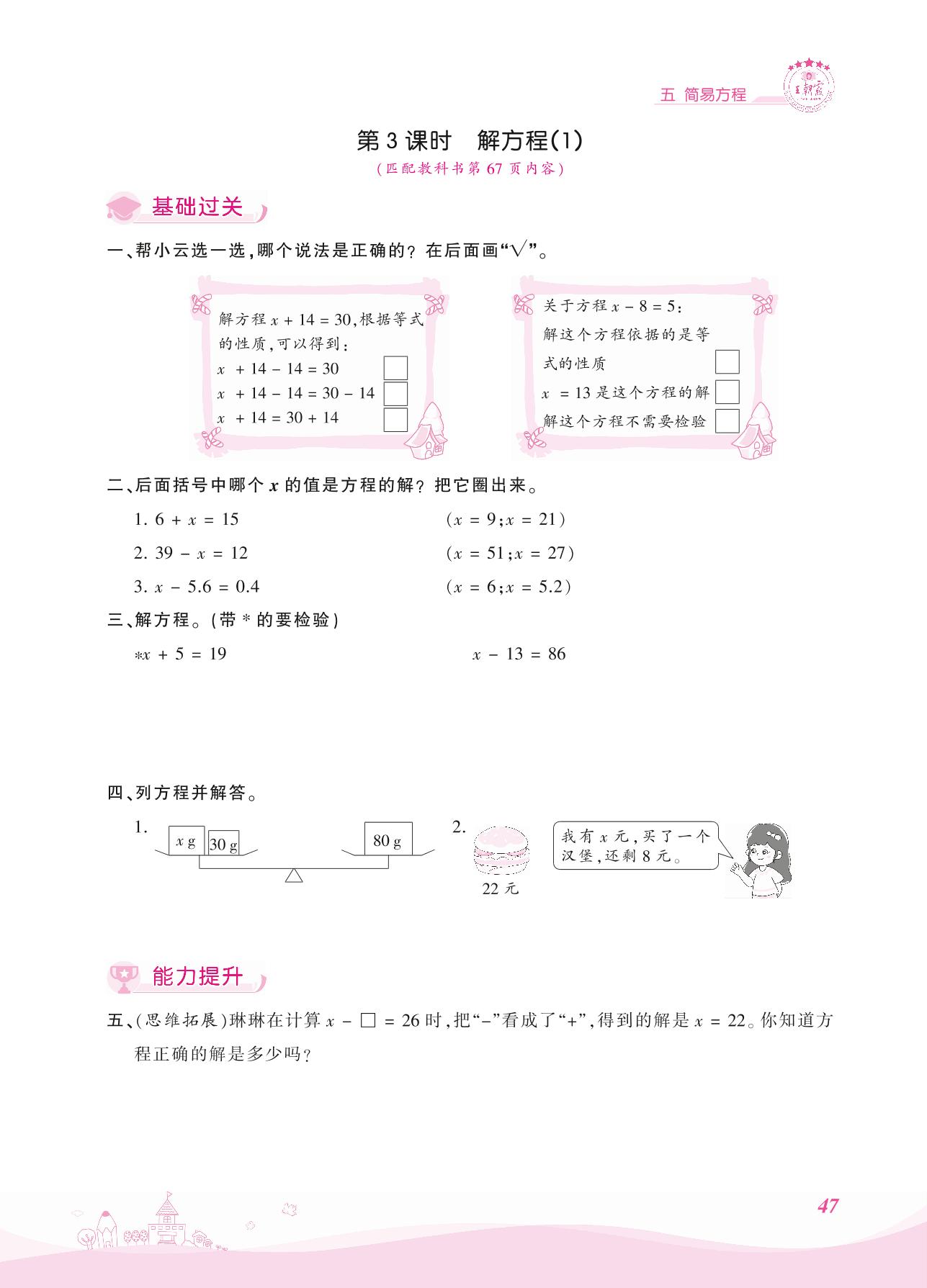 2021上册五年级数学人教版 五 简易方程 2. 解简易方程——第3课时 解方程(1)