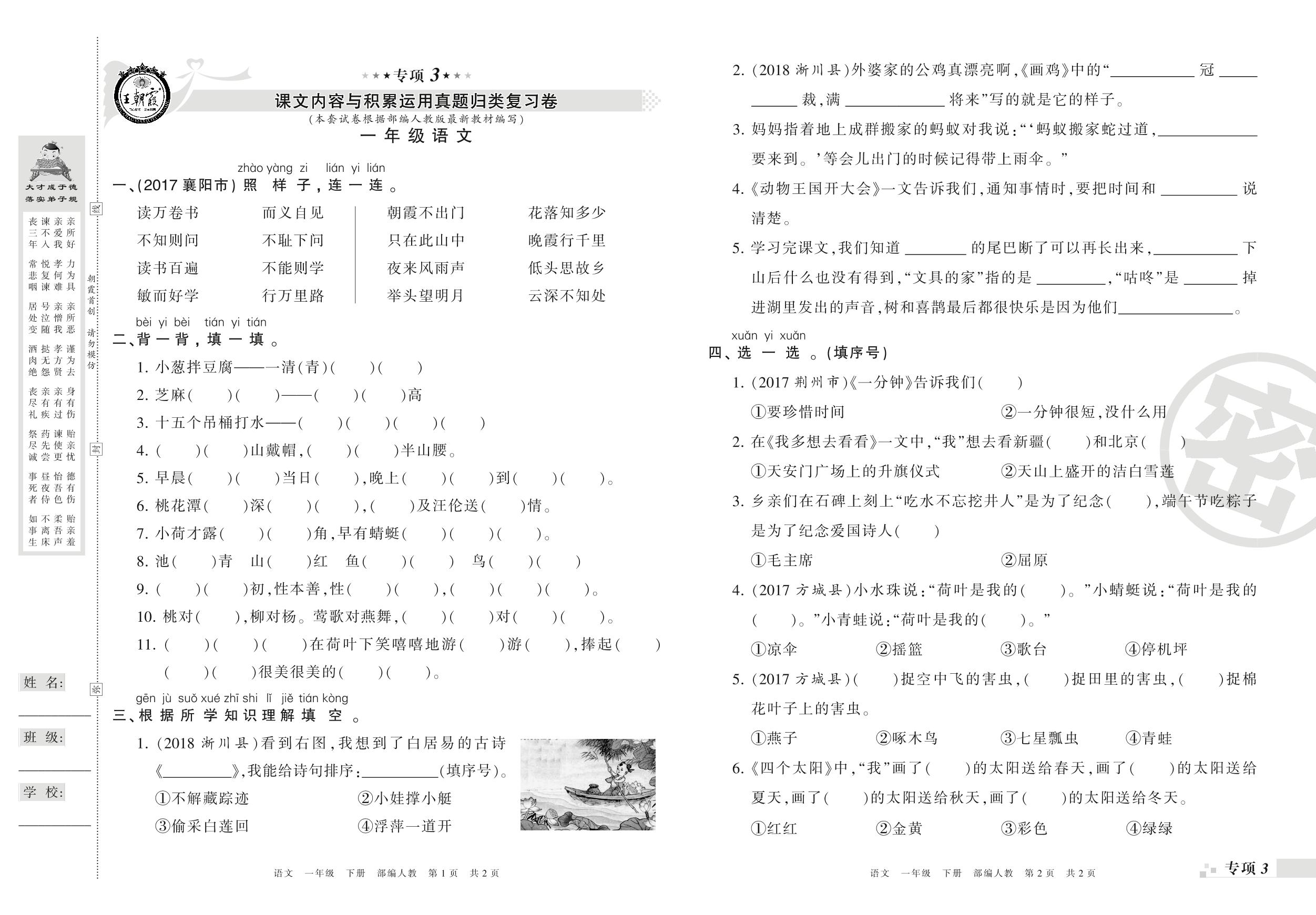 王朝霞期末专项卷——课文内容与积累运用、写话真题归类复习一年级下册语文(人教版)_R210731181534【0】