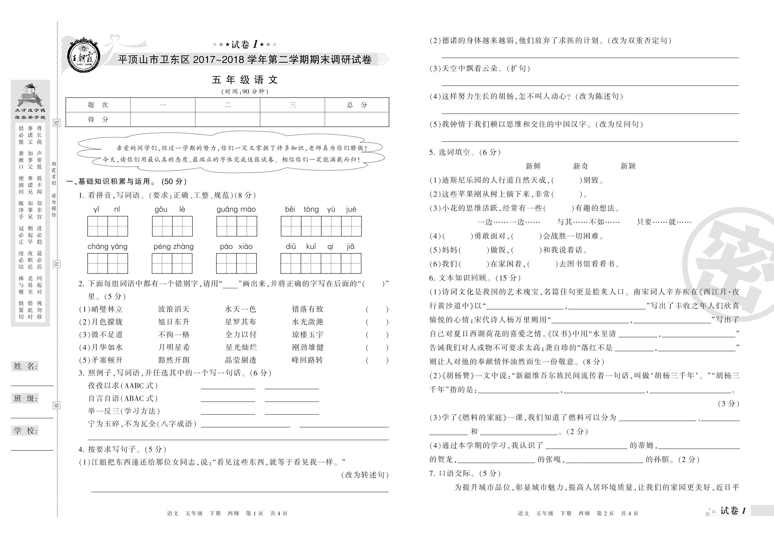 2017-2018学年第二学期平顶山市卫东区五年级语文试卷(西师版)【1】