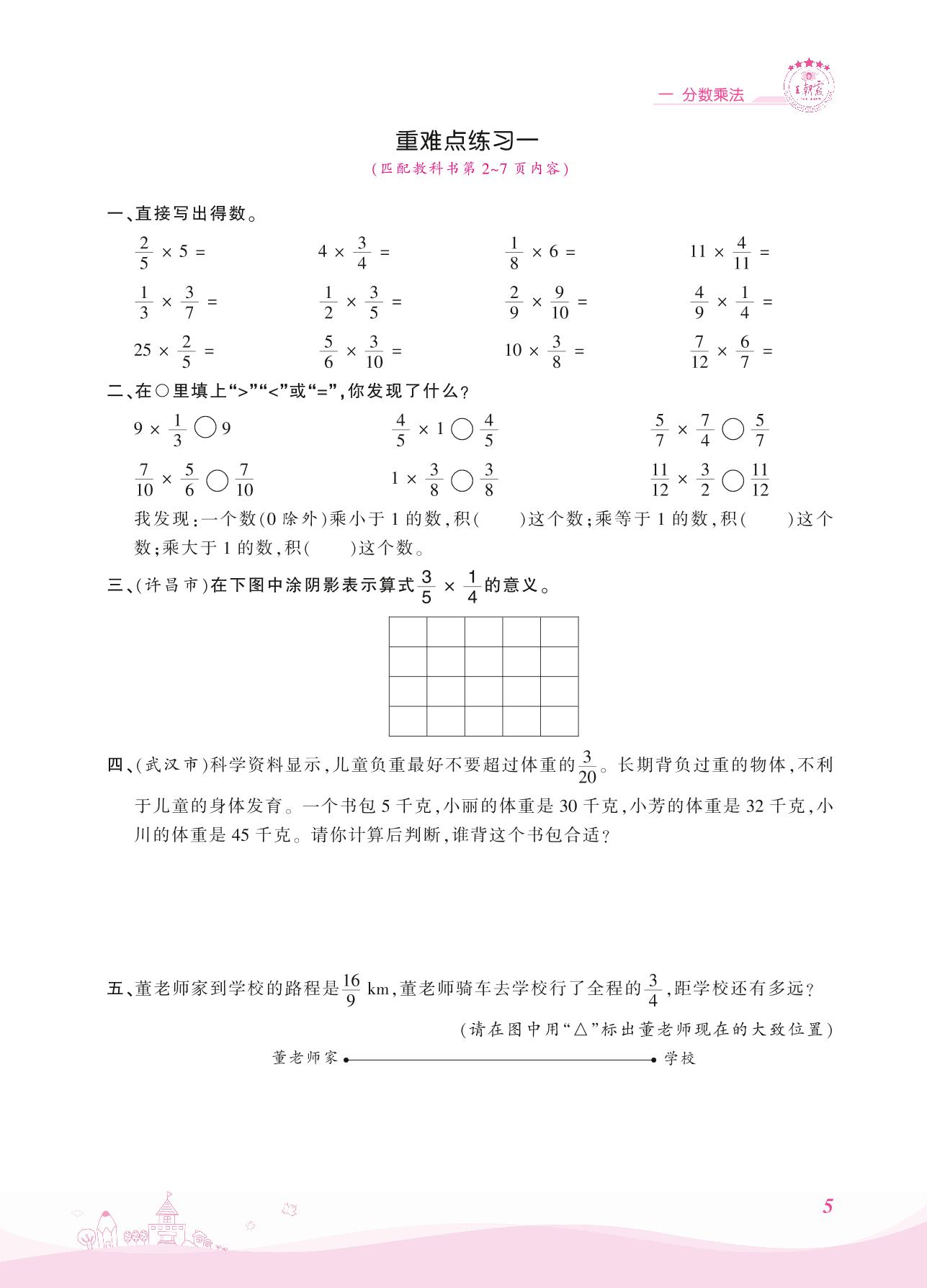 2021上册六年级数学人教版 一 分数乘法——重难点练习一