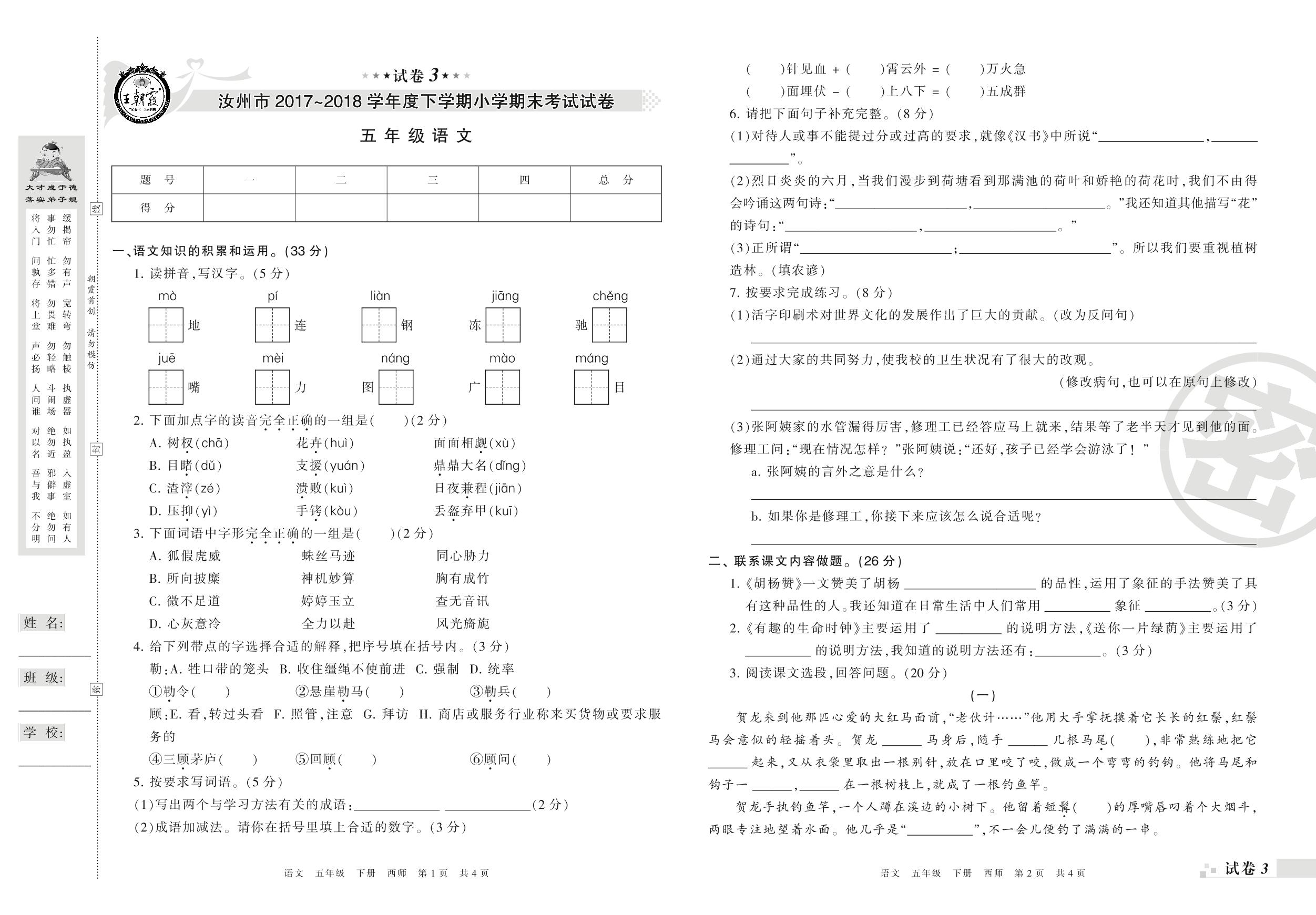 2017-2018学年第二学期汝州市五年级语文试卷(西师版)【3】