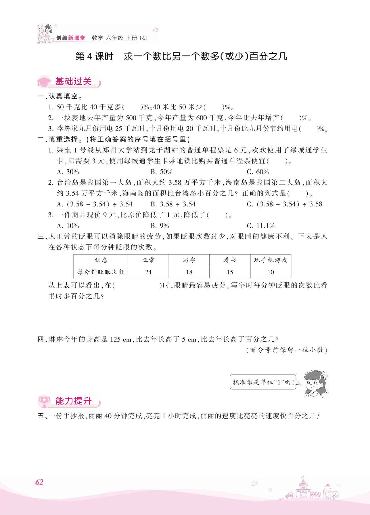 2021上册六年级数学人教版 六 百分数(一)——第4课时 求一个数比另一个数多(或少)百分之几