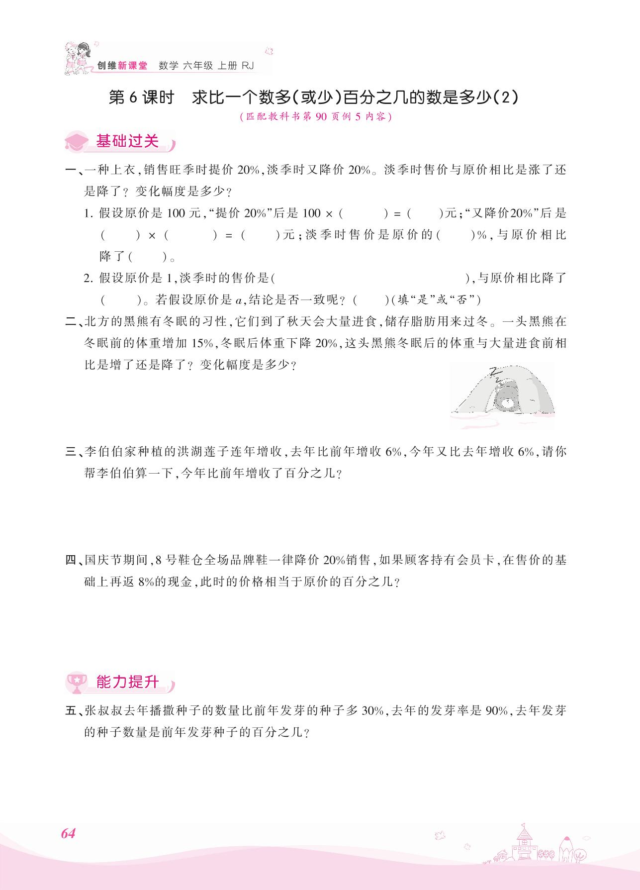 2021上册六年级数学人教版 六 百分数(一)——第6课时 求比一个数多(或少)百分之几的数是多少(2)