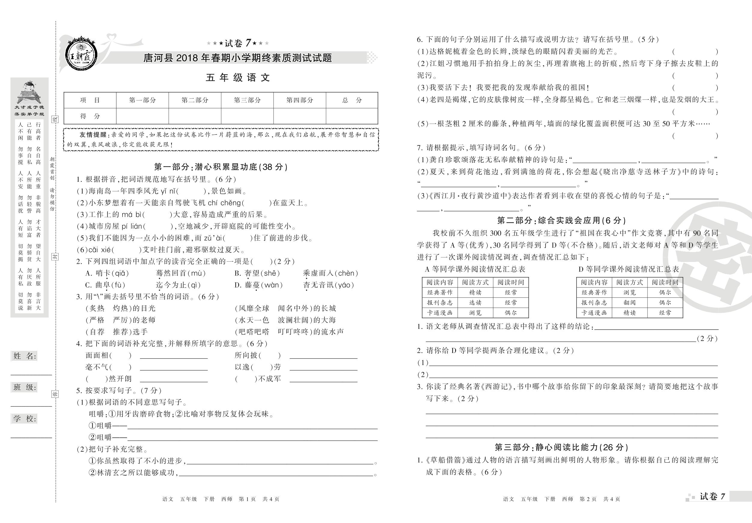 2017-2018学年第二学期南阳市唐河县五年级语文试卷(西师版)【7】