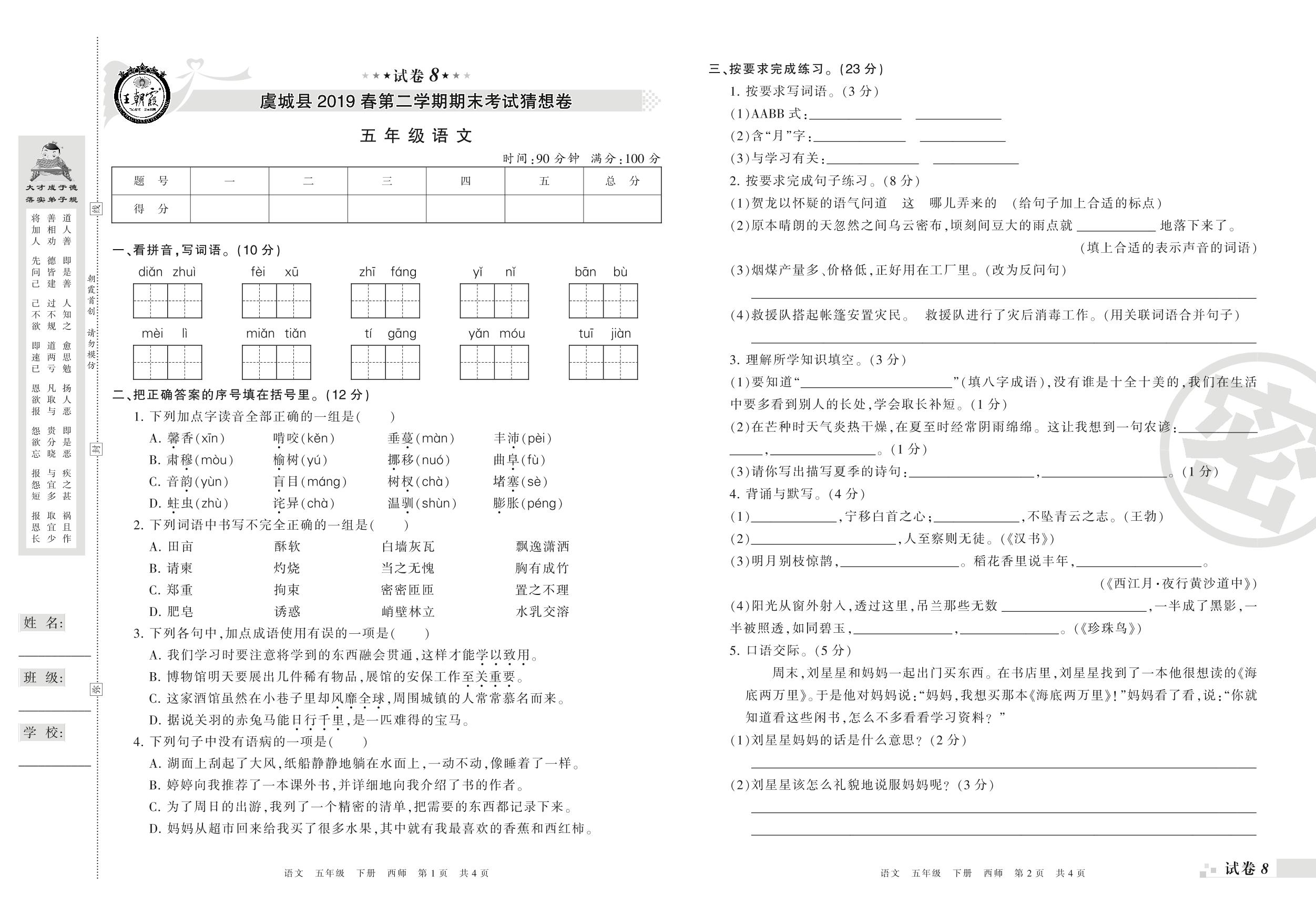 2017-2018学年第二学期商丘市虞城县五年级语文试卷(西师版)【8】