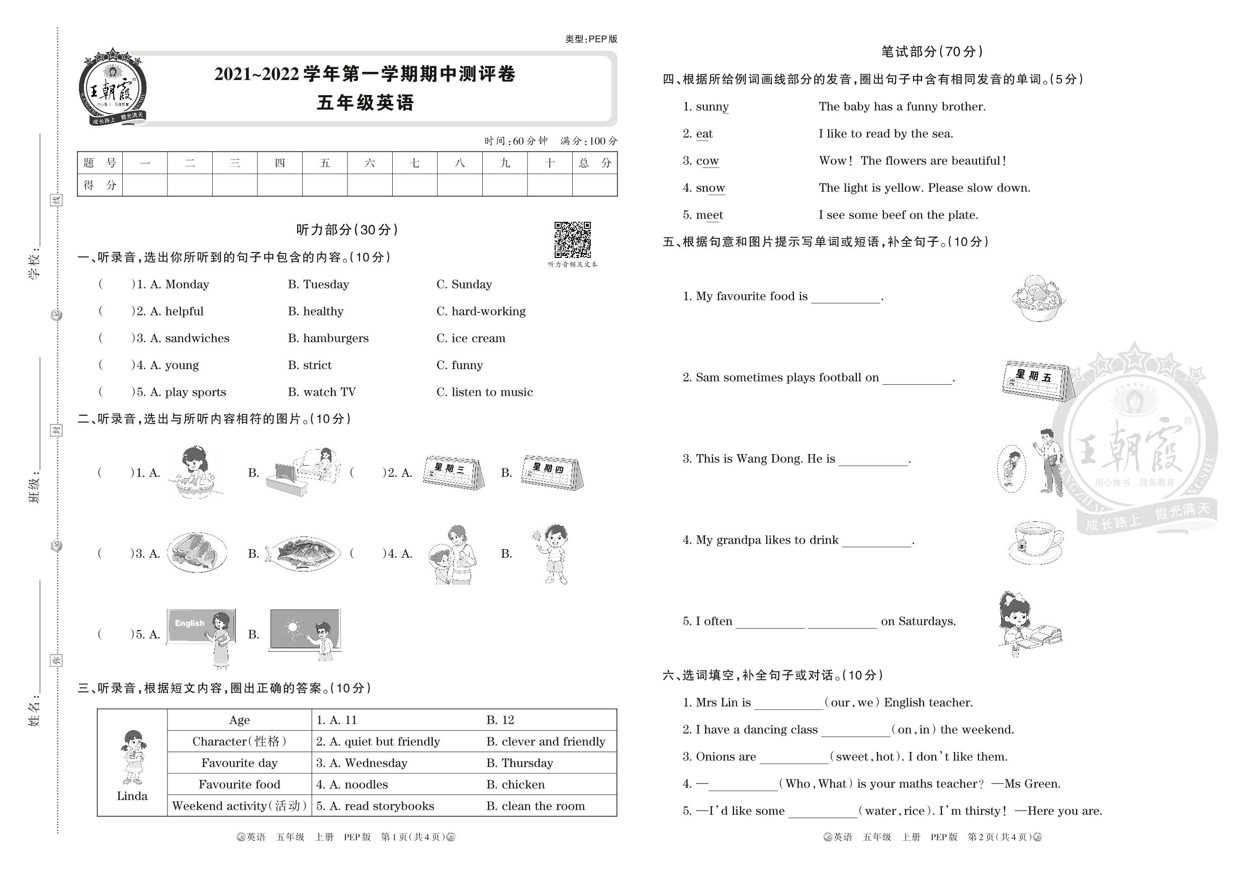 2021~2022学年第一学期期中测评卷 五年级英语(PEP版)