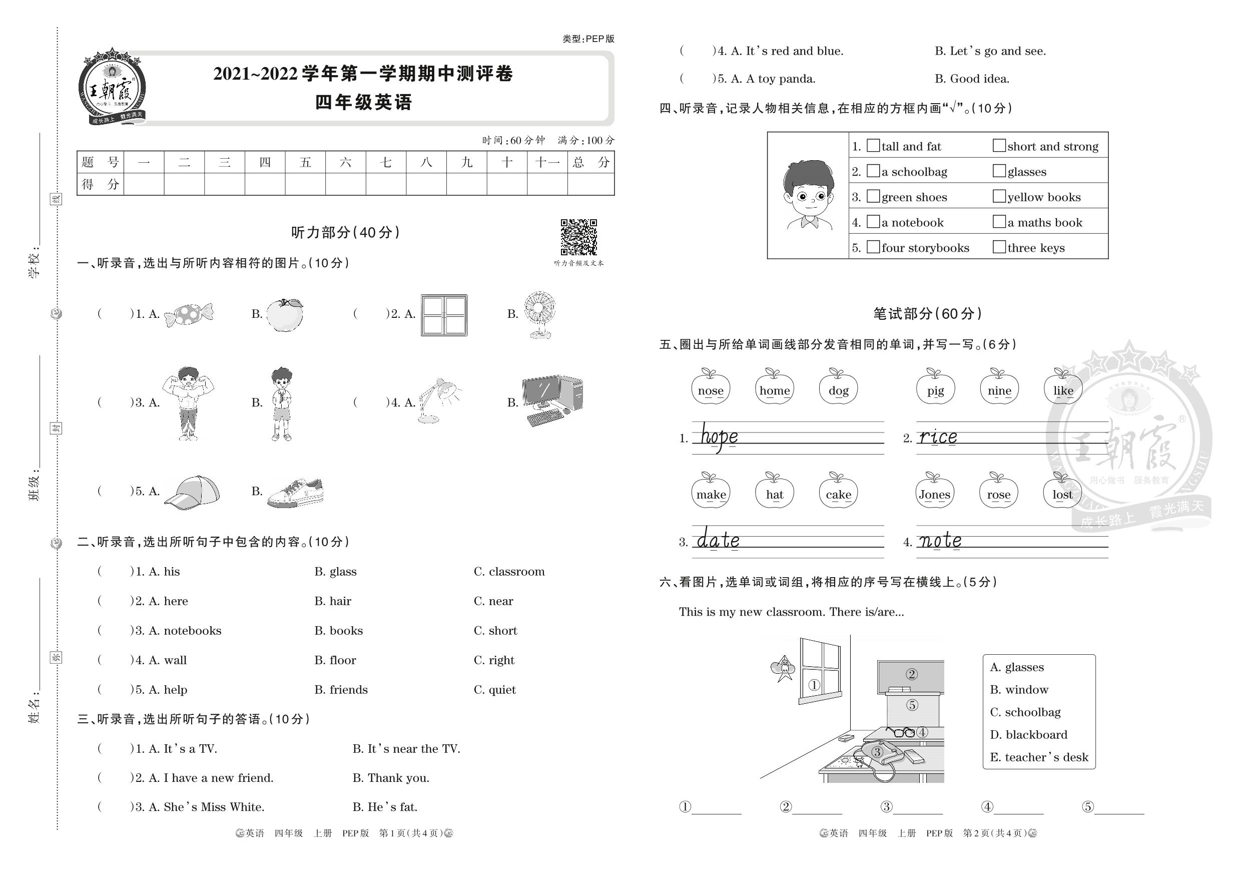 2021~2022学年第一学期期中测评卷 四年级英语(PEP版)