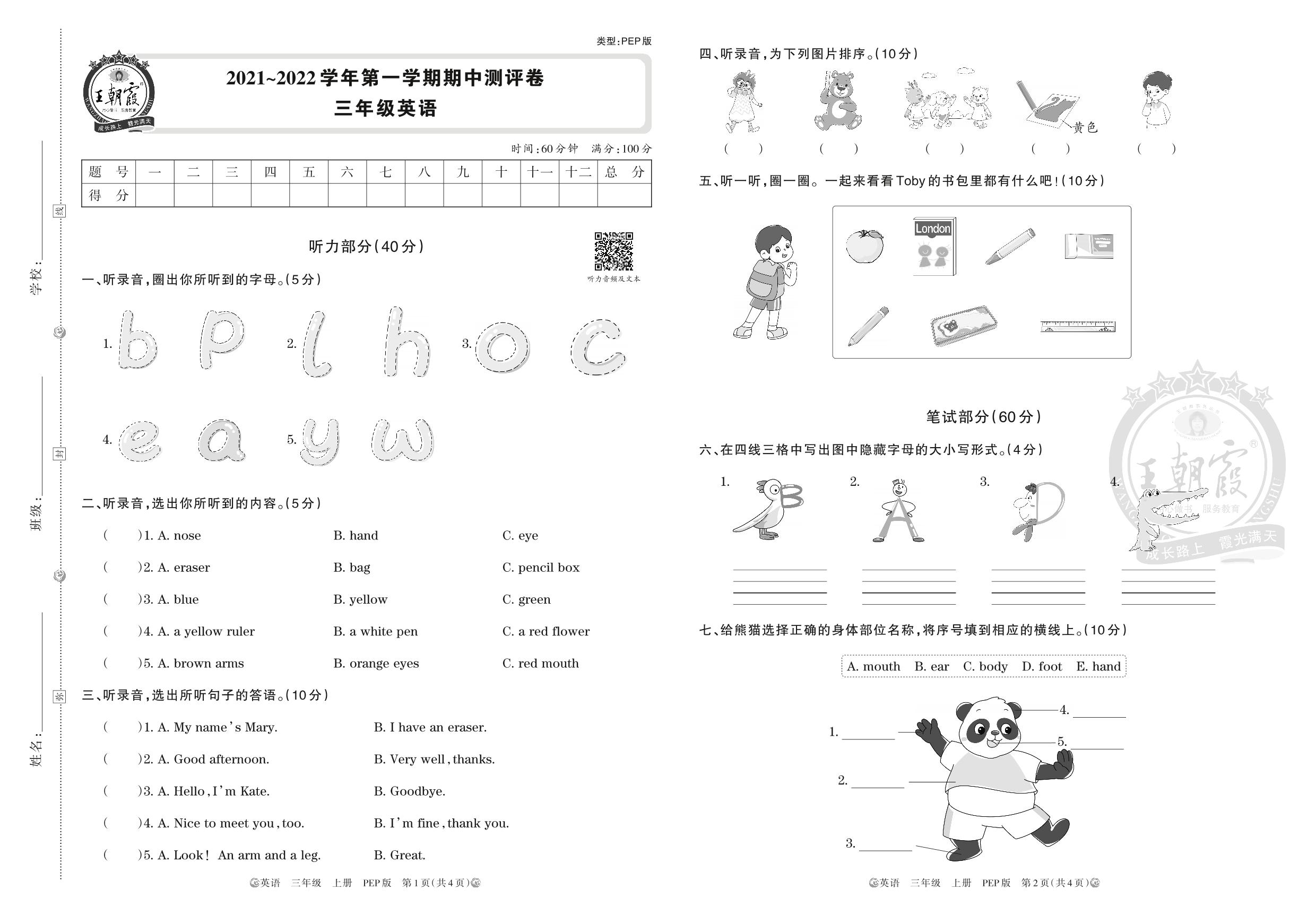 三年级英语人教PEP版(三起始)上册期中卷