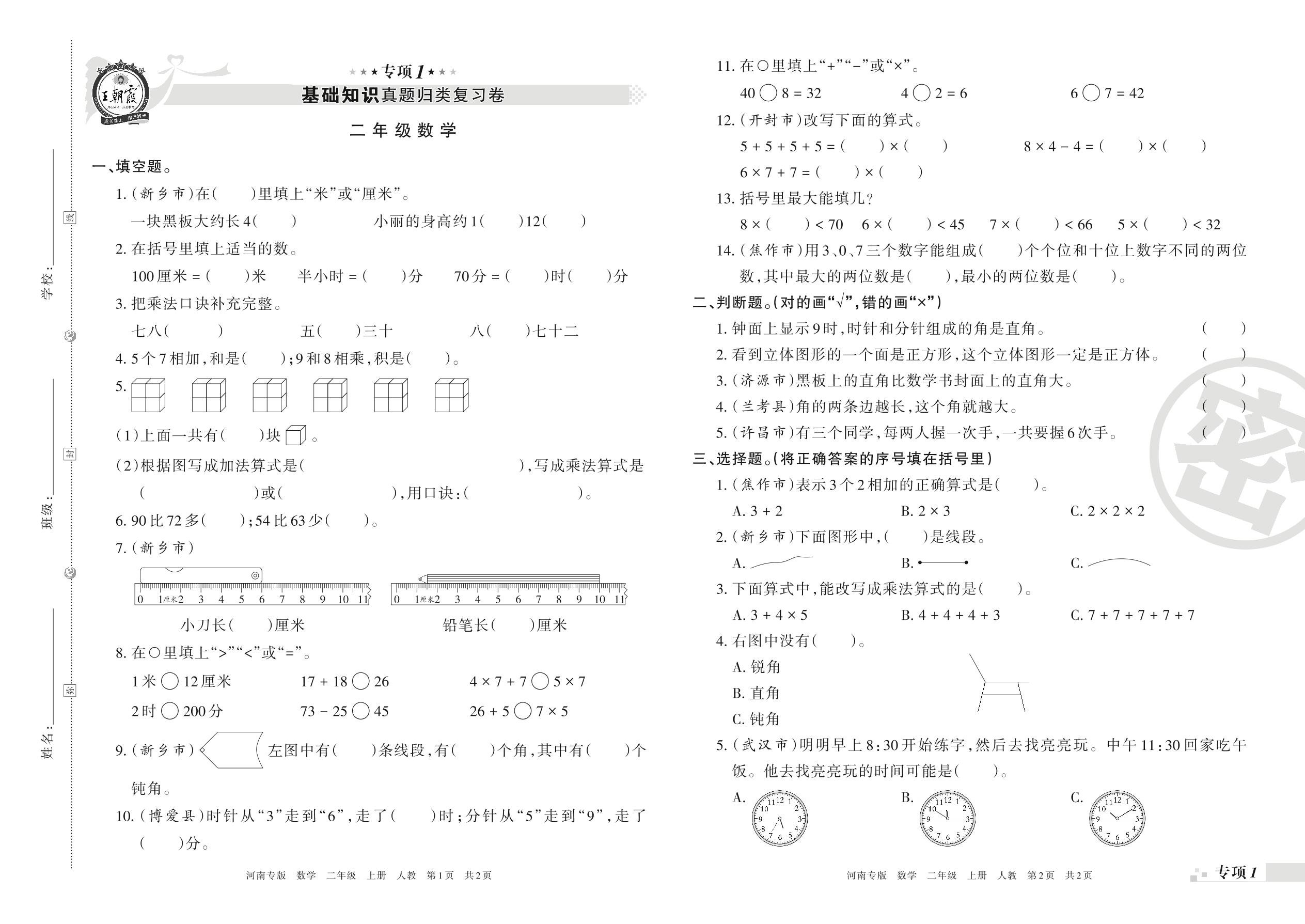 王朝霞期末专项卷——基础知识真题归类复习二年级上册数学(人教版)正文