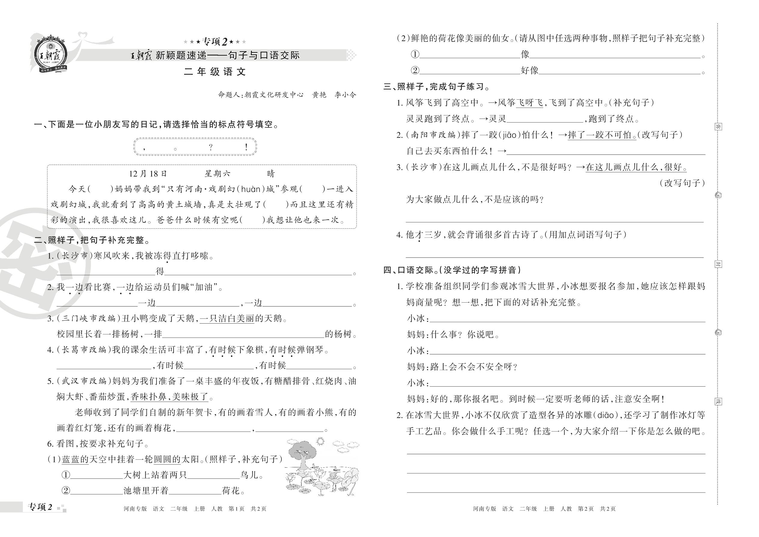 王朝霞期末项卷——句子与口语交际二年级上册语文(人教版)正文