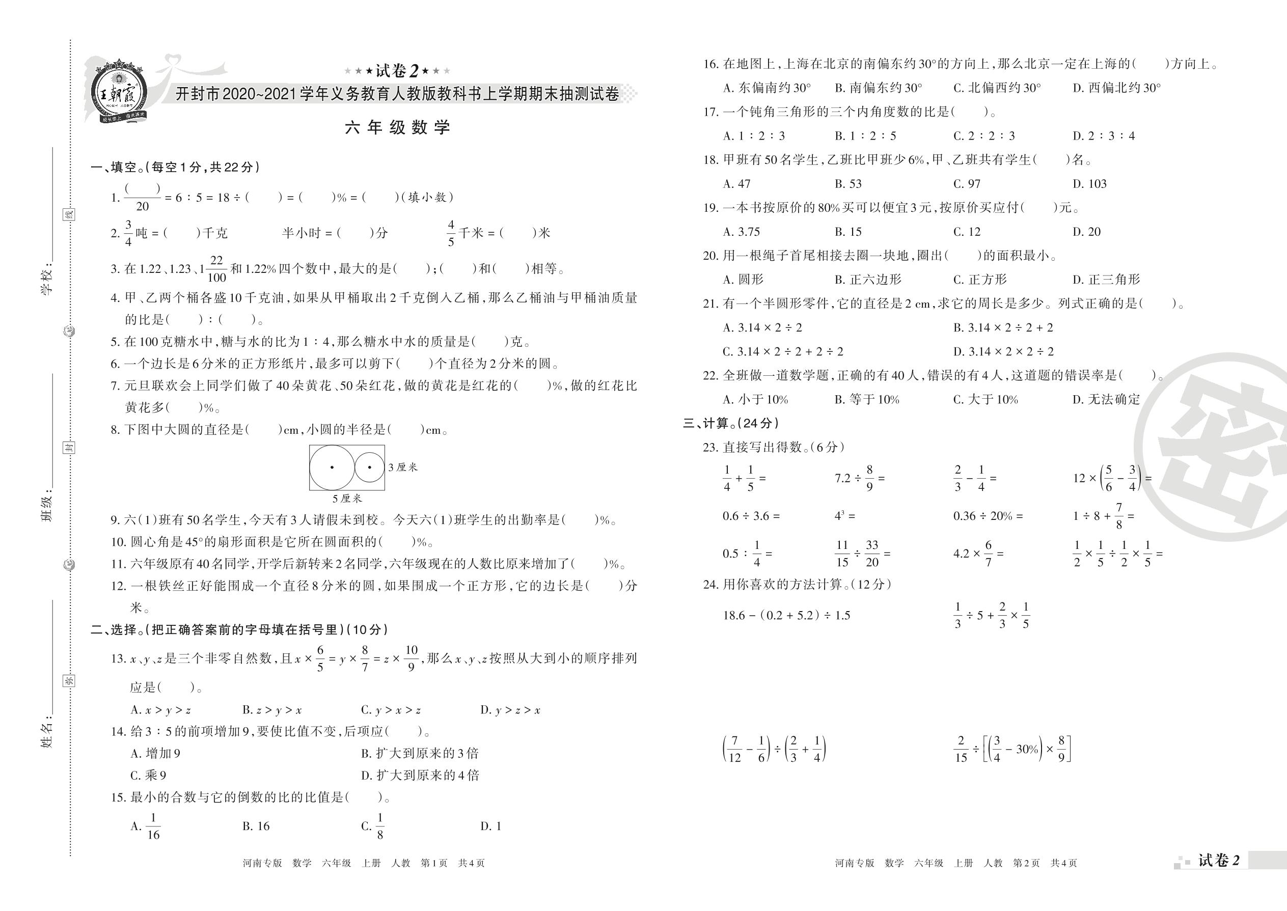 开封市2020~2021学年义务教育人教版教科书上学期期末抽测试卷六年级数学人教版【2】