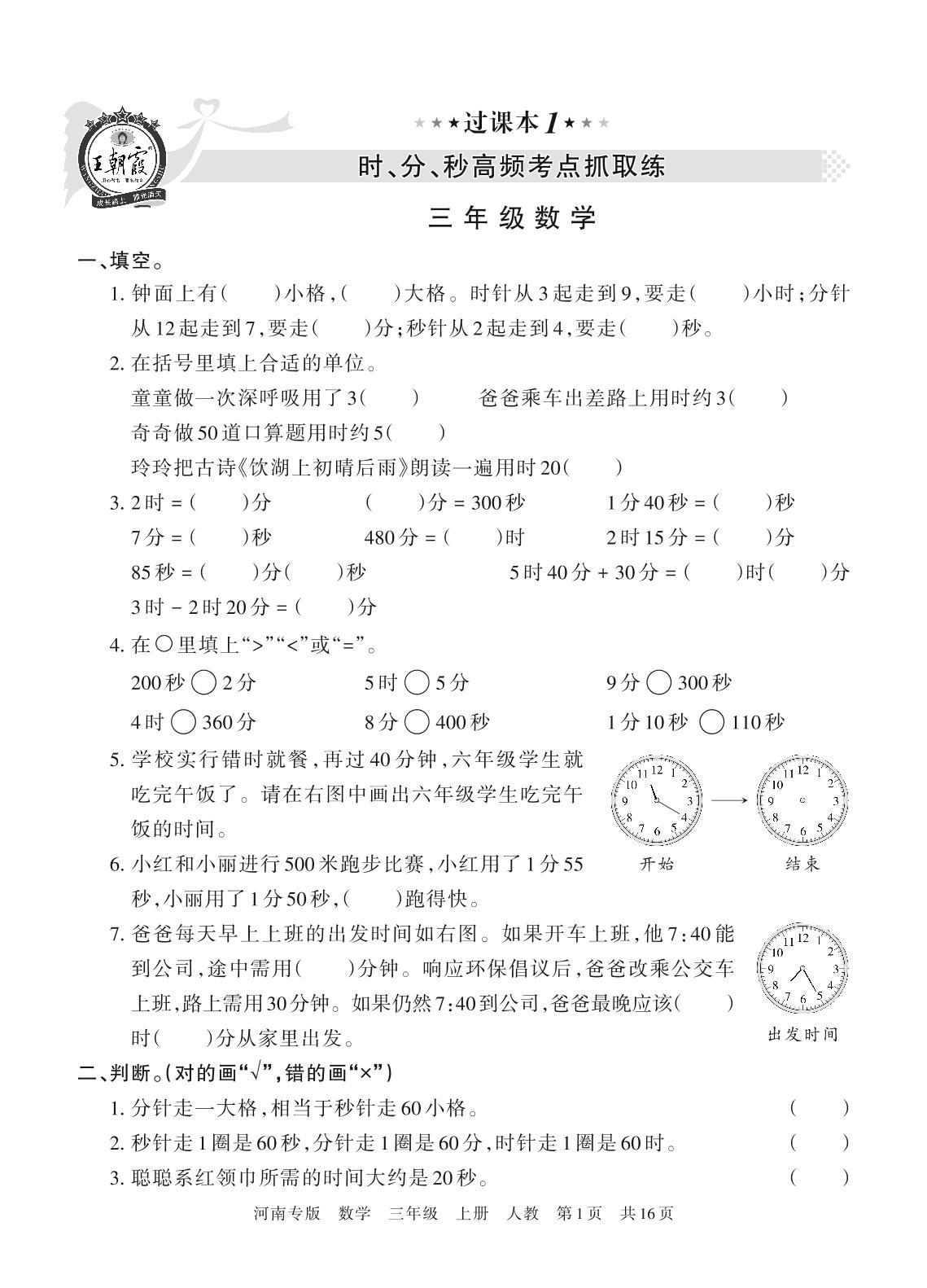 王朝霞期末过课本——时、分、秒高频考点抓取练三年级上册数学(人教版)