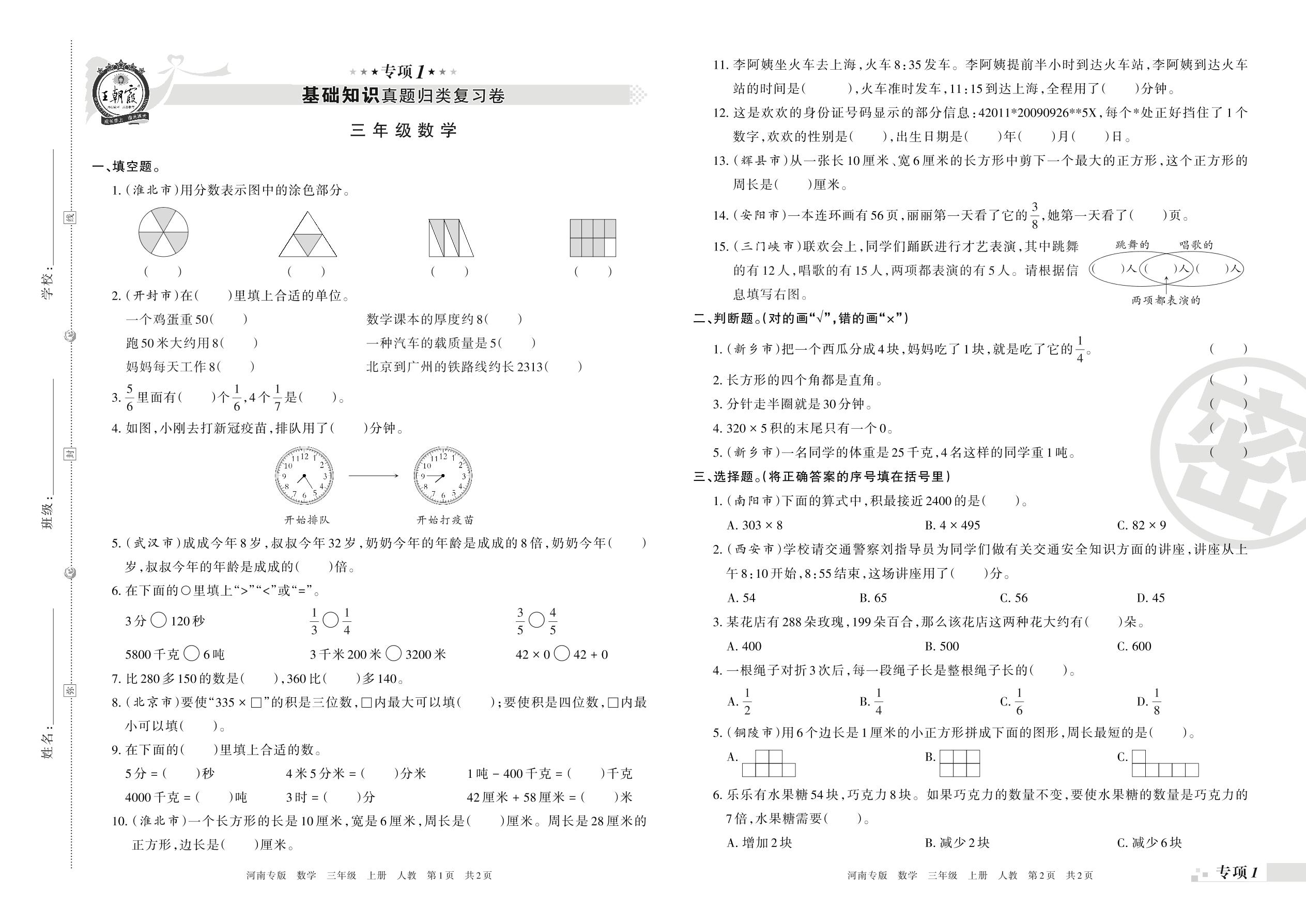 王朝霞期末专项卷——基础知识真题归类复习三年级上册数学(人教版)