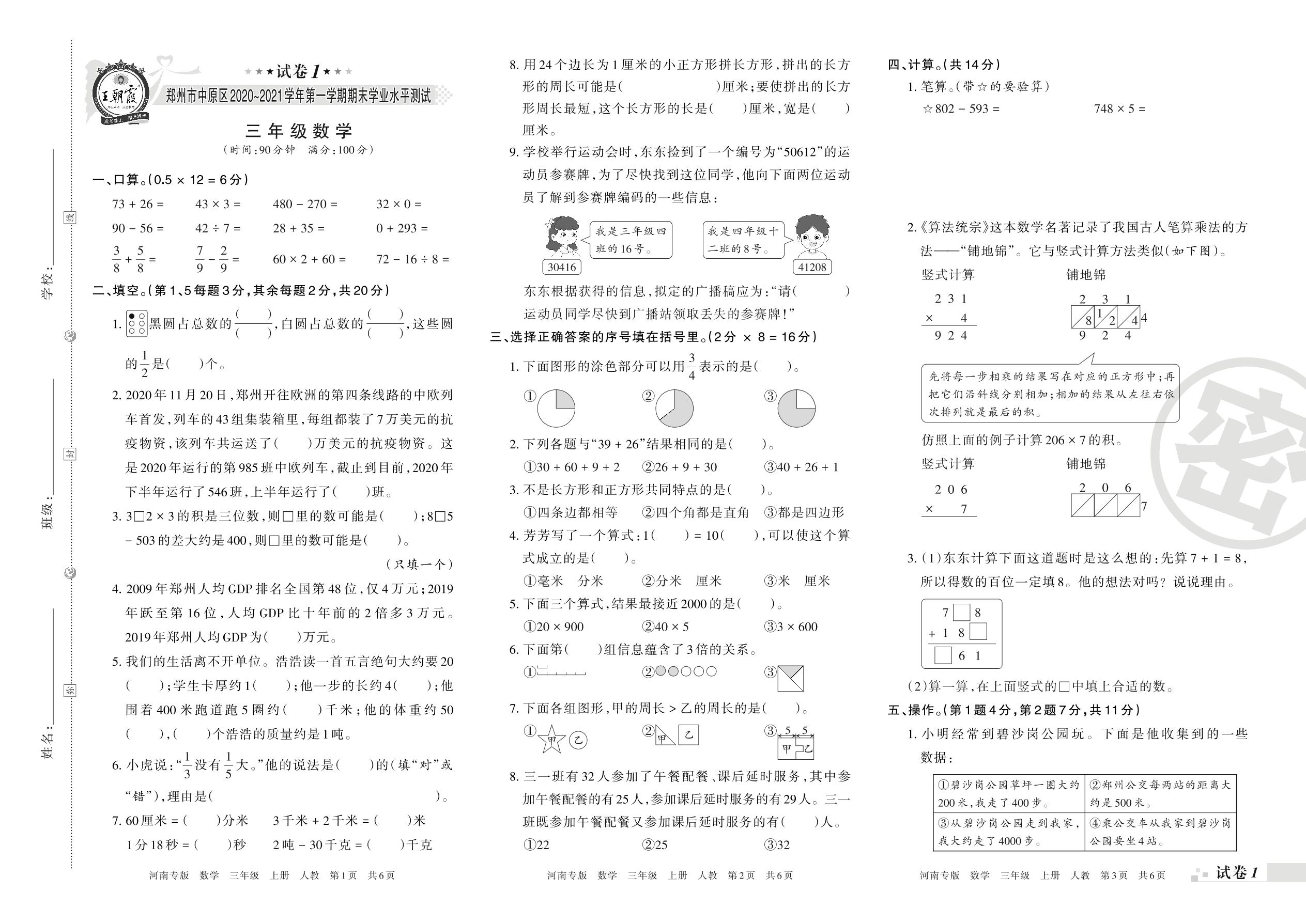 郑州市中原区2020~2021学年第一学期期末学业水平测试三年级数学人教版【1】