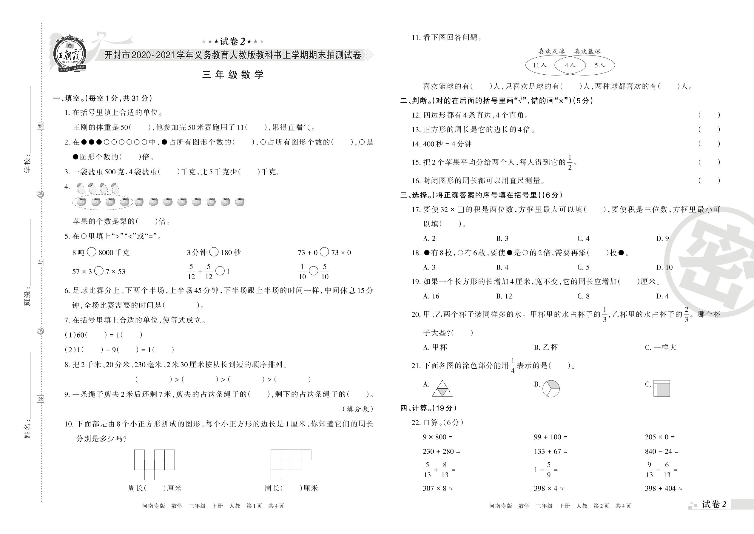 开封市2020~2021学年义务教育人教版教科书上学期期末抽测试卷三年级数学人教版【2】