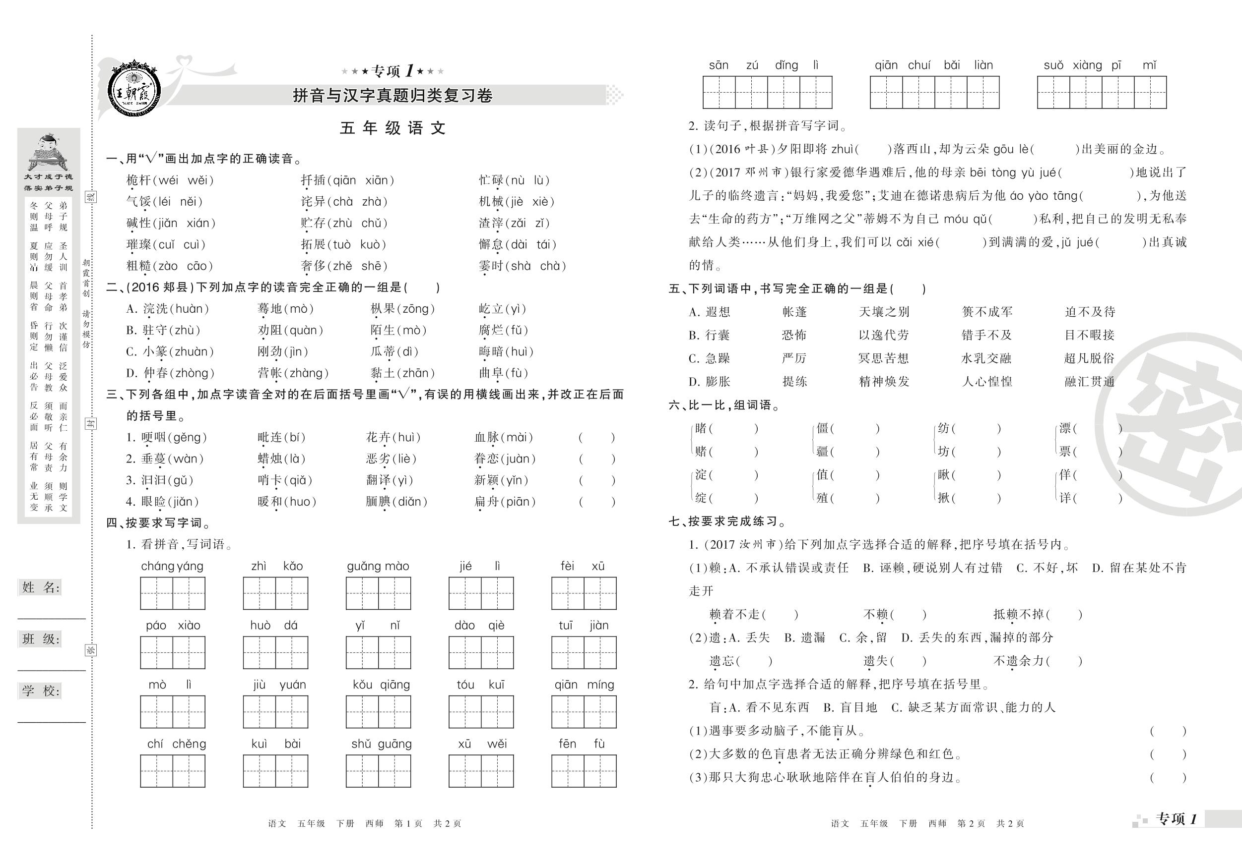 王朝霞期末专项卷——拼音与汉字、词语真题归类复习五年级下册语文(西师版)_R210801201605【0】