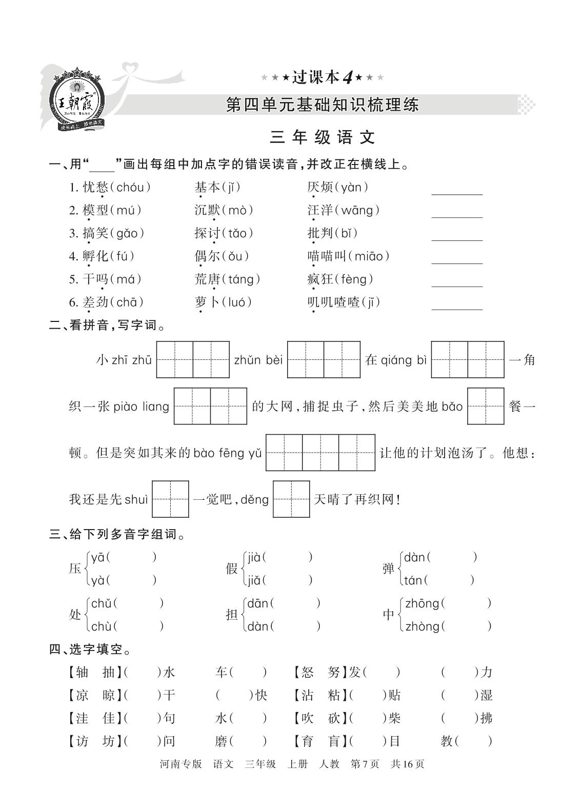 王朝霞期末过课本——第四单元基础知识梳理练三年级上册语文(人教版)正文