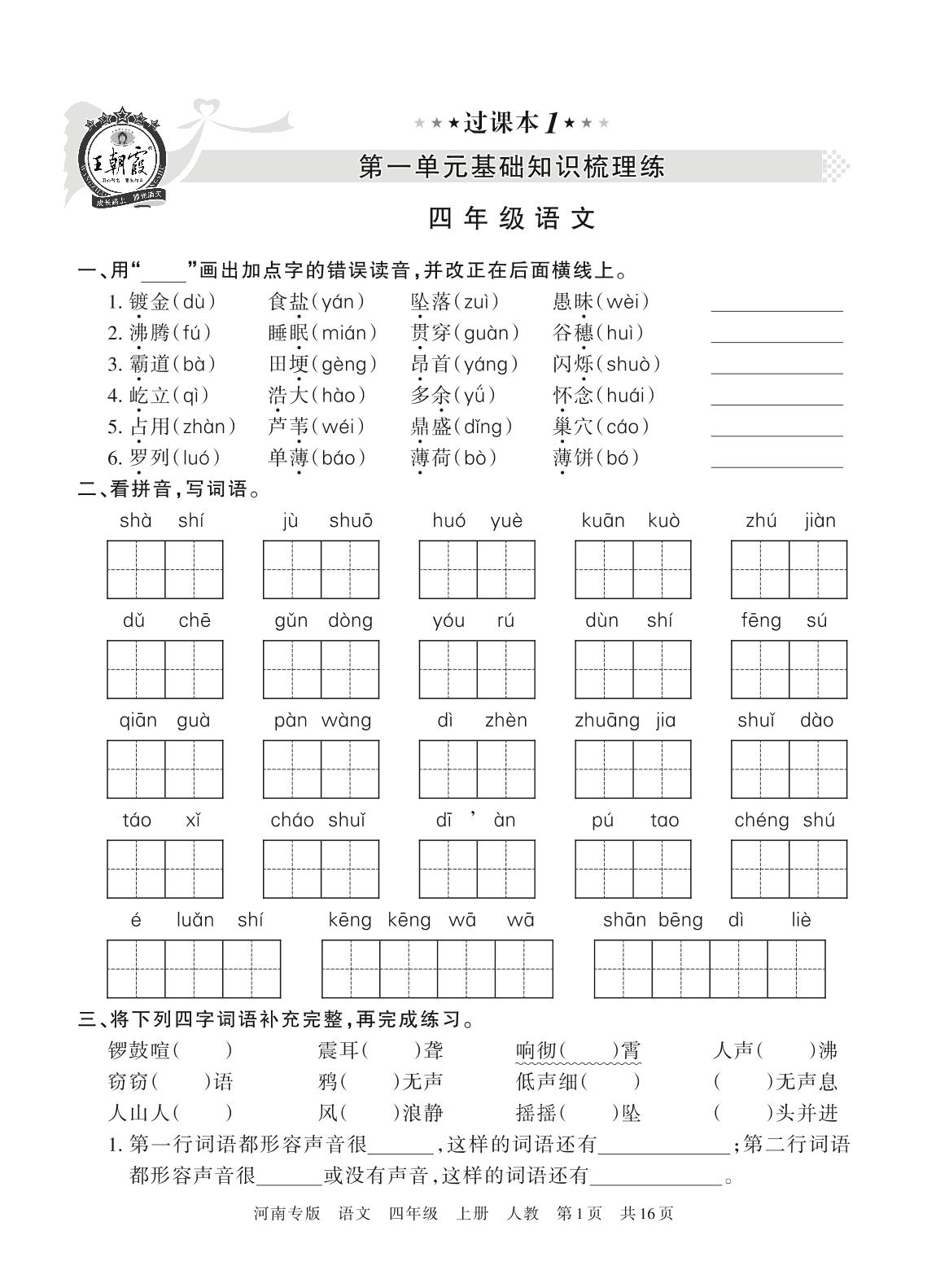 王朝霞期末过课本——第一单元基础知识梳理练四年级上册语文(人教版)
