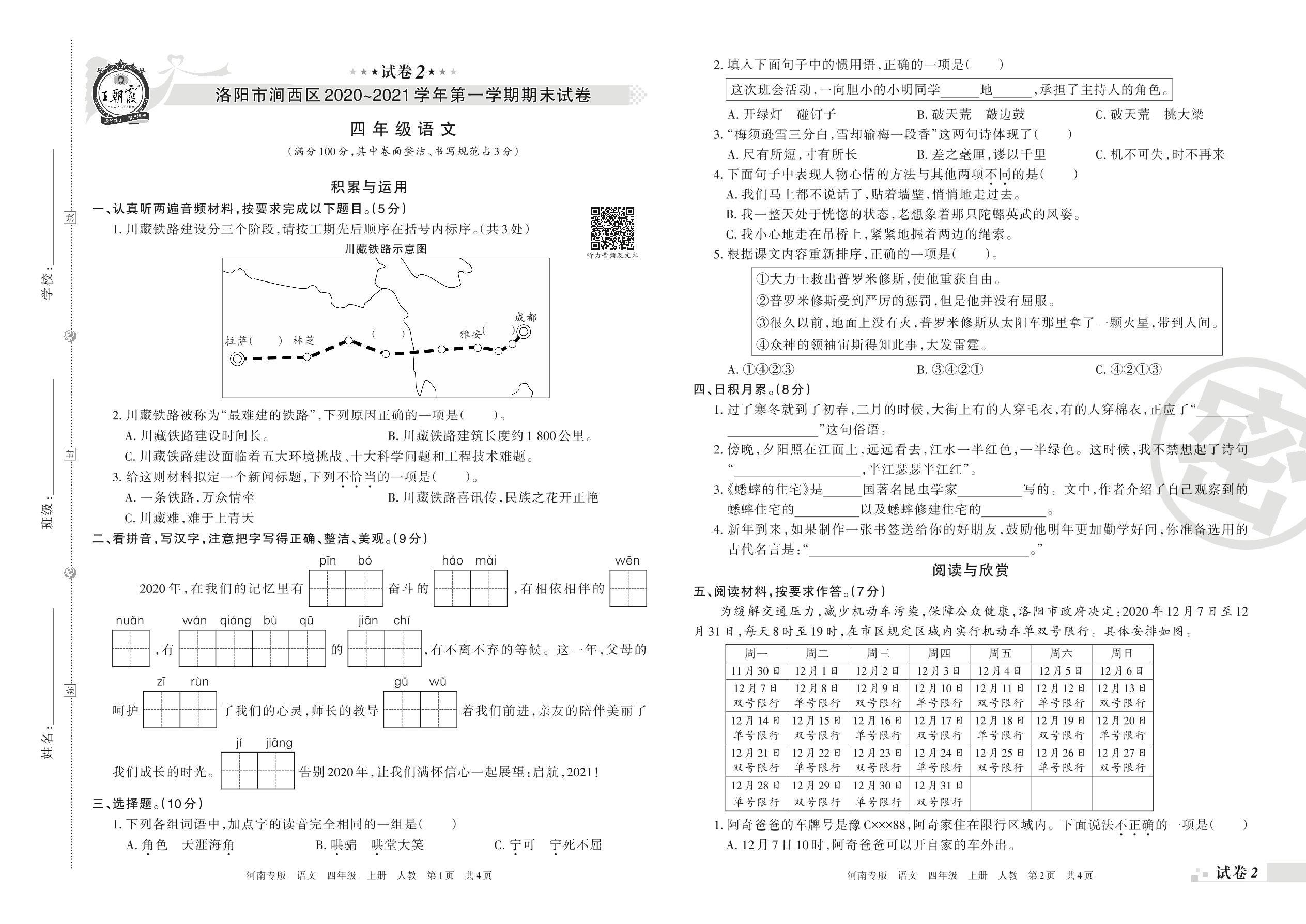 洛阳市涧西区2020~2021学年第一学期期末试卷四年级语文(人教版)【2】